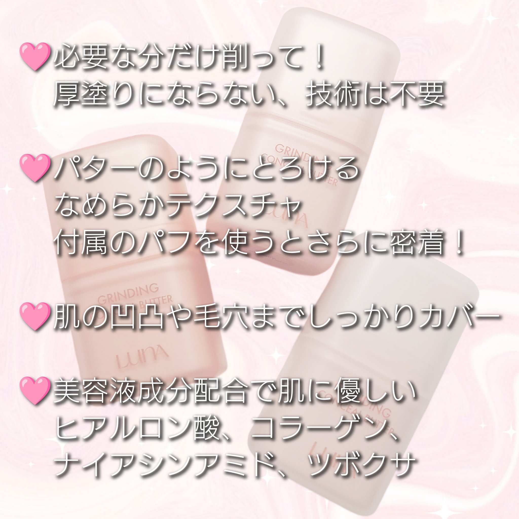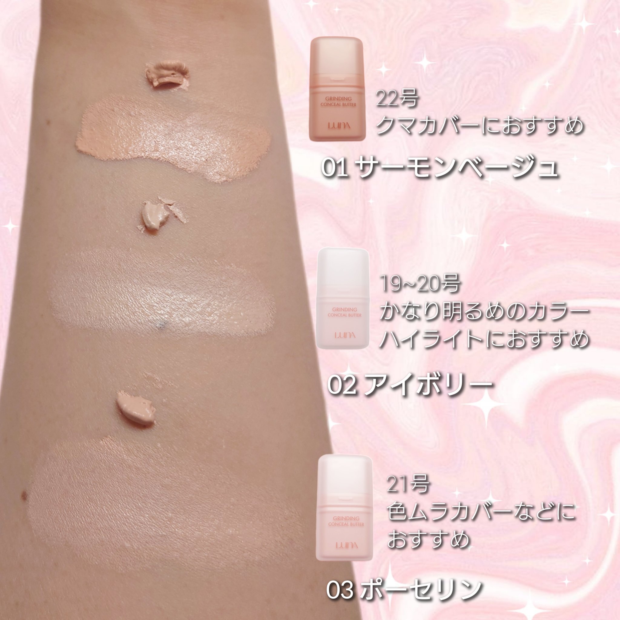 LUNAの『グラインディングコンシールバター』は使う分だけ回して繰り出すタイプのコンシーラー。自分で量を調節できるから、厚塗り感出ないしシミやそばかす、赤みなどの肌悩みをしっかりカバー! 出てくる時は固形なのに、バターみたいになめらかに溶けてしっかり密着🧈 カラー展開は3色で、01 サーモンベージュは赤み寄りのベージュだから目の下のクマ用におすすめ! 内臓のパフを使うとより密着力が高まって、サラサラの仕上がりになるから是非試してみて💗