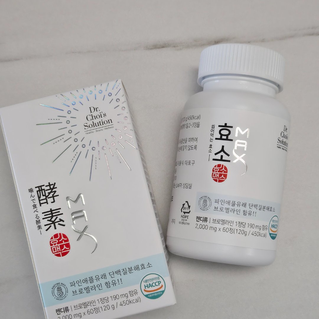 - 酵素マックスはブロメラインを贅沢に含有した噛んで食べる健康食品です。 ※ リニューアル案内 酵素の活性化を高めるために「二重コーティング」の適用でもう少し硬くなりました。 飲み込まずに、口の中で軽く溶かした後、必ず噛んで召し上がってください!!! [補足説明] 「酵素マックス」に含まれたブロメラインは190mg配合。 [摂取方法] そのまま飲み込まずにしっかり噛んで摂取!!! 1〜3粒が摂取目安量です。