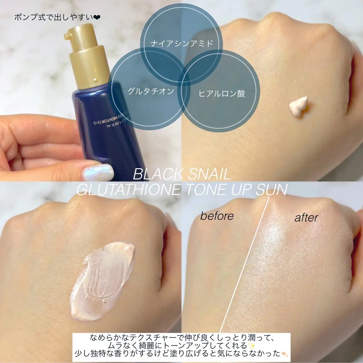 グルタチオンやナイアシンアミドが入った 化粧下地としても使える日焼け止め! 乾燥しにくくしっとりとしたテクスチャ ベタつかずピタっと密着✨ ブラックスネイルグルタチオントーンアップサン