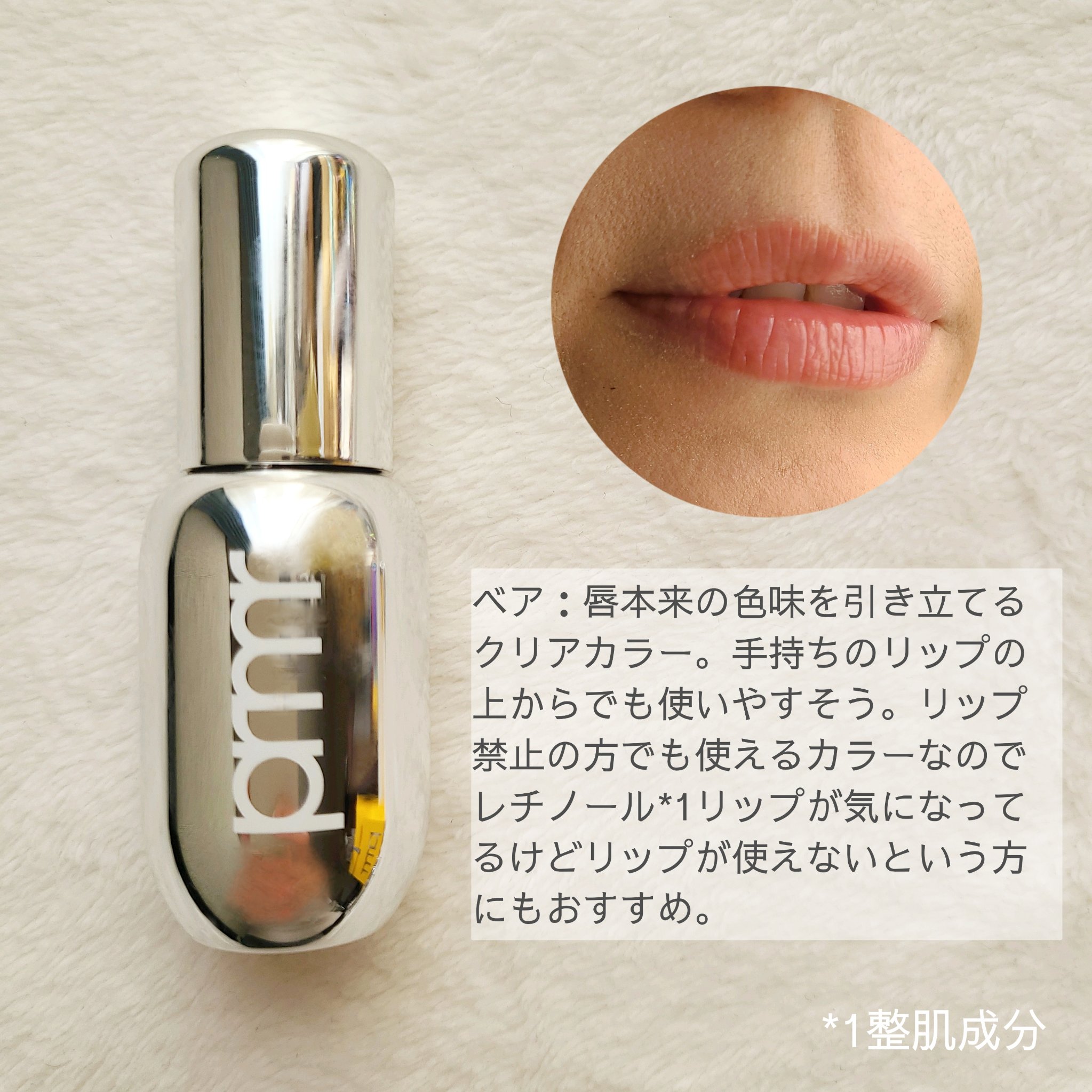 - <ロージー> 水添ポリ(C6-14オレフィン)、水添ポリイソブテン、トリ(カプリル酸/カプリン酸)グリセリル、(エチレン/プロピレン/スチレン)コポリマー、酢酸トコフェロール、ダイズ油、パルマローザ油、ニオイテンジクアオイ花油、ヒマシ油、ホホバ種子油、ローズマリー葉油、ダマスクバラ花油、オレンジ果皮エキス、テトラヘキシルデカン酸アスコルビル、レチノール、セラミドNP、ダイズポリペプチド、乳酸桿菌培養溶解質、加水分解エクステンシン、ヒアルロン酸Na、加水分解ヒアルロン酸、ヒアルロン酸クロスポリマーNa、ヒアルロン酸、アセチルヒアルロン酸Na、エチルヘキシルグリセリン、トリイソステアリン酸ポリグリセリル-2、ラウリン酸ポリグリセリル-10、(ブチレン/エチレン/スチレン)コポリマー、テトラ(ジ-t-ブチルヒドロキシヒドロケイヒ酸)ペンタエリスリチル、水、水酸化Al、トリエトキシカプリリルシラン、グリセリン、プロパンジオール、BG、1,2-ヘキサンジオール、水添レシチン、トコフェロール、メントキシプロパンジオール、マンダリンオレンジ果皮油、ベルガモット果実油、パチョリ油、カミツレ花油、ラベンダー油、酸化チタン、酸化鉄、赤201、赤202 <ベア> 水添ポリ(C6-14オレフィン)、水添ポリイソブテン、トリ(カプリル酸/カプリン酸)グリセリル、(エチレン/プロピレン/スチレン)コポリマー、酢酸トコフェロール、ヒマワリ種子油、ダイズ油、パルマローザ油、ニオイテンジクアオイ花油、ヒマシ油、ローズマリー葉油、ホホバ種子油、ダマスクバラ花油、ニンジン根エキス、オレンジ果皮エキス、レチノール、β-カロチン、セラミドNP、ダイズポリペプチド、乳酸桿菌培養溶解質、ヒアルロン酸Na、加水分解エクステンシン、ラウリン酸ポリグリセリル-10、ヒアルロン酸クロスポリマーNa、加水分解ヒアルロン酸、ヒアルロン酸、アセチルヒアルロン酸Na、テトラヘキシルデカン酸アスコルビル、エチルヘキシルグリセリン、(ブチレン/エチレン/スチレン)コポリマー、グリセリン、BG、水、プロパンジオール、1,2-ヘキサンジオール、トコフェロール、テトラ(ジ-t-ブチルヒドロキシヒドロケイヒ酸)ペンタエリスリチル、水添レシチン、メントキシプロパンジオール、マンダリンオレンジ果皮油、ベルガモット果実油、パチョリ油、カミツレ花油、ラベンダー油 <スカイコーラル> 水添ポリ(C6-14オレフィン)、水添ポリイソブテン、トリ(カプリル酸/カプリン酸)グリセリル、(エチレン/プロピレン/スチレン)コポリマー、酢酸トコフェロール、ダイズ油、パルマローザ油、ニオイテンジクアオイ花油、ヒマシ油、ホホバ種子油、ローズマリー葉油、ダマスクバラ花油、オレンジ果皮エキス、テトラヘキシルデカン酸アスコルビル、レチノール、セラミドNP、ダイズポリペプチド、乳酸桿菌培養溶解質、加水分解エクステンシン、ヒアルロン酸Na、加水分解ヒアルロン酸、ヒアルロン酸クロスポリマーNa、ヒアルロン酸、アセチルヒアルロン酸Na、エチルヘキシルグリセリン、トリイソステアリン酸ポリグリセリル-2、ラウリン酸ポリグリセリル-10、(ブチレン/エチレン/スチレン)コポリマー、テトラ(ジ-t-ブチルヒドロキシヒドロケイヒ酸)ペンタエリスリチル、水、グリセリン、プロパンジオール、BG、1,2-ヘキサンジオール、水添レシチン、トコフェロール、メントキシプロパンジオール、マンダリンオレンジ果皮油、ベルガモット果実油、パチョリ油、カミツレ花油、ラベンダー油、酸化チタン、酸化鉄、赤226、黄5 <シャイレッド> 水添ポリ(C6-14オレフィン)、水添ポリイソブテン、トリ(カプリル酸/カプリン酸)グリセリル、(エチレン/プロピレン/スチレン)コポリマー、酢酸トコフェロール、ダイズ油、パルマローザ油、ニオイテンジクアオイ花油、ヒマシ油、ホホバ種子油、ローズマリー葉油、ダマスクバラ花油、オレンジ果皮エキス、テトラヘキシルデカン酸アスコルビル、レチノール、セラミドNP、ダイズポリペプチド、乳酸桿菌培養溶解質、加水分解エクステンシン、ヒアルロン酸Na、加水分解ヒアルロン酸、ヒアルロン酸クロスポリマーNa、ヒアルロン酸、アセチルヒアルロン酸Na、エチルヘキシルグリセリン、トリイソステアリン酸ポリグリセリル-2、ラウリン酸ポリグリセリル-10、(ブチレン/エチレン/スチレン)コポリマー、テトラ(ジ-t-ブチルヒドロキシヒドロケイヒ酸)ペンタエリスリチル、水、グリセリン、プロパンジオール、BG、1,2-ヘキサンジオール、水添レシチン、トコフェロール、メントキシプロパンジオール、マンダリンオレンジ果皮油、ベルガモット果実油、パチョリ油、カミツレ花油、ラベンダー油、赤202、黄5