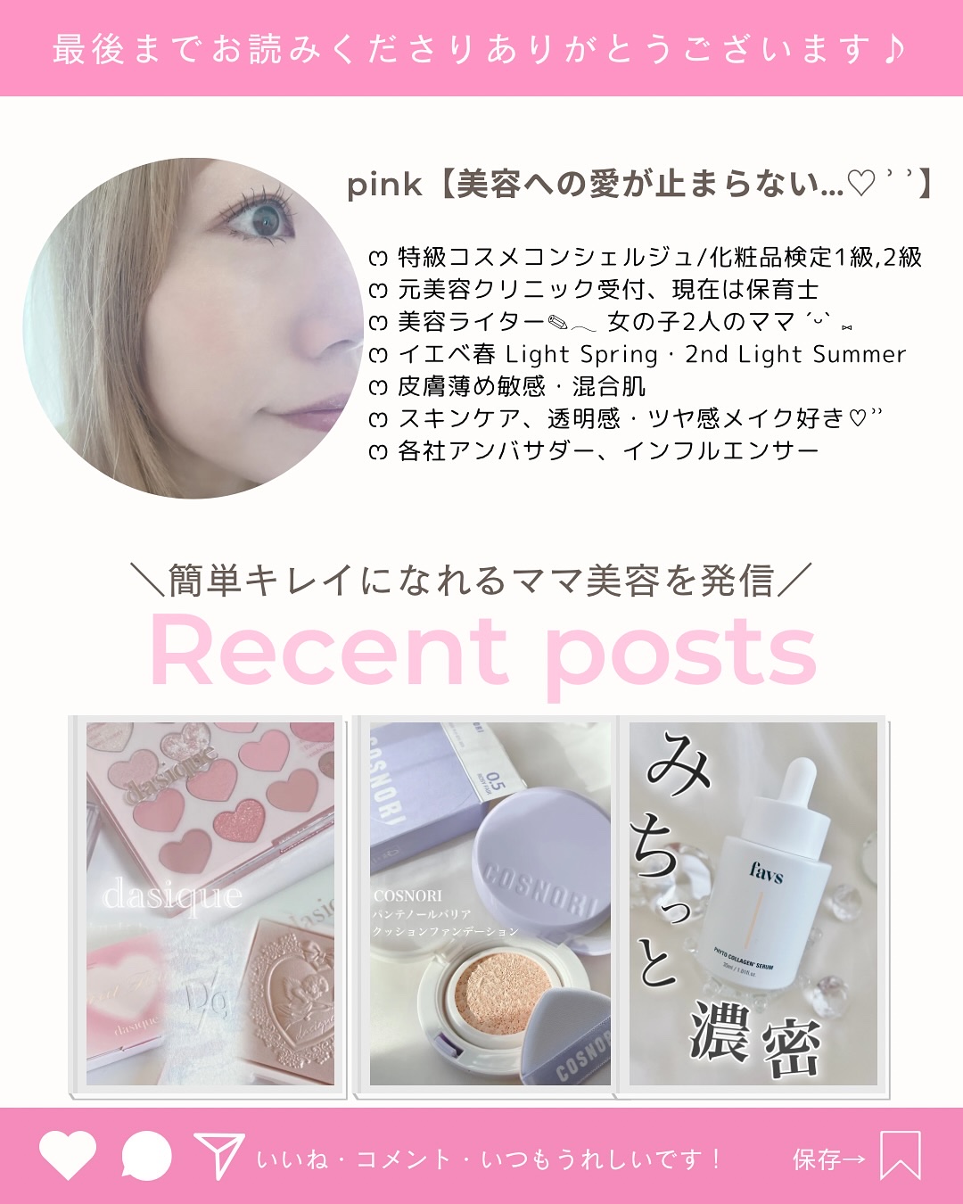 かわいいピンクをイメージして購入したんだけど、明るさ重視のライトスプリングの私には、暗い色味でした… よく言えば、落ち着いたカラーです。 私にはちょっと目に入りやすくて、これを使うとだいたい目が痛くなってしまい、目薬が手放せない… ただ、2色だけで陰影が付けれて、考えなくていいからメイクが楽チン!それに尽きます!!