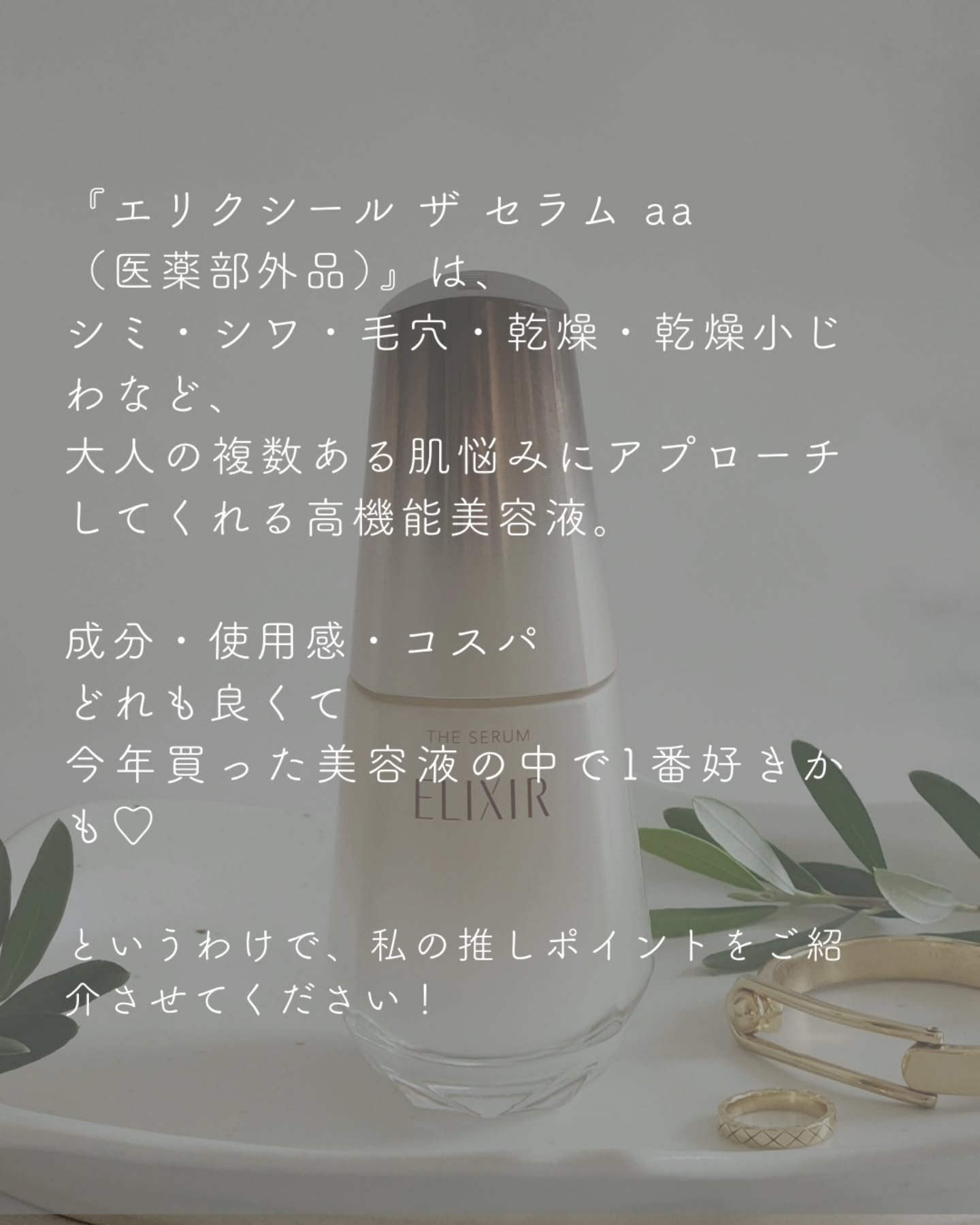 - 【医薬部外品】独自の先進技術と21種類の豊富な美容成分で、複数の大人の美肌要素に、一気にアプローチ。薬用高機能美容液。 ○独自の高機能成分「コアキシマイド※3」をはじめとした21種類の豊富な美容成分を、角層深くまで届けます。 ※3 ヒドロキシエチルエチレンウレア(ハリ整肌・保湿) ○メラニンの生成を抑え、シミ・そばかすを防ぐ美白有効成分「m-トラネキサム酸※6」を配合 ※6 有効成分m-トラネキサム酸(トラネキサム酸)配合。メラニンの生成を抑え、シミ・ソバカスを防ぐ。 ○エリクシール独自技術「倍速エッセンステクノロジー」搭載 独自の高機能成分「コアキシマイド※3」が、約2倍※4速くリリースされる技術 ※3 ヒドロキシエチルエチレンウレア(ハリ整肌・保湿) ※4 人口膜で計測した当該技術の有無による放出時間を比較 ○複数の大人の美肌要素に、一気にアプローチ。 ハリに満ち、明るくなめらかな、「つや玉」輝く理想の肌へ導きます。 ○リラックス感のある心地よいアクアフローラルの香り ○アレルギーテスト済み (全てのかたにアレルギーが起きないというわけではありません)。 ○朝晩の使用で約1.5か月※11使用できます。 ※11 使用方法に沿った使い方での目安 ○ノンコメドジェニックテスト済み(全ての方にニキビができないというわけではありません。)