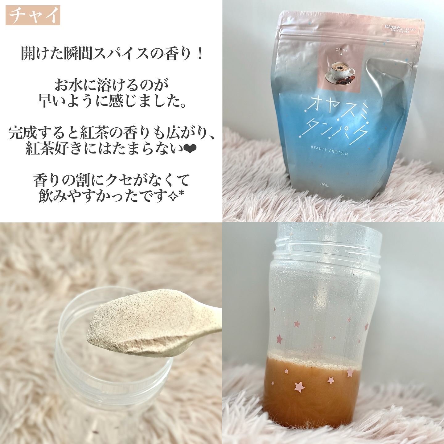 チャイ味はスパイスの香りがふわっと広がり甘すぎずさっぱりとした味🫖 デザート感覚で飲めるから続けやすい🙆♀️✨ うさぎのイラストがデザインされているシェイカーがかわいすぎる🐰💓 デザインがお気に入りだと使うたびに気分が上がって良いよね🥰