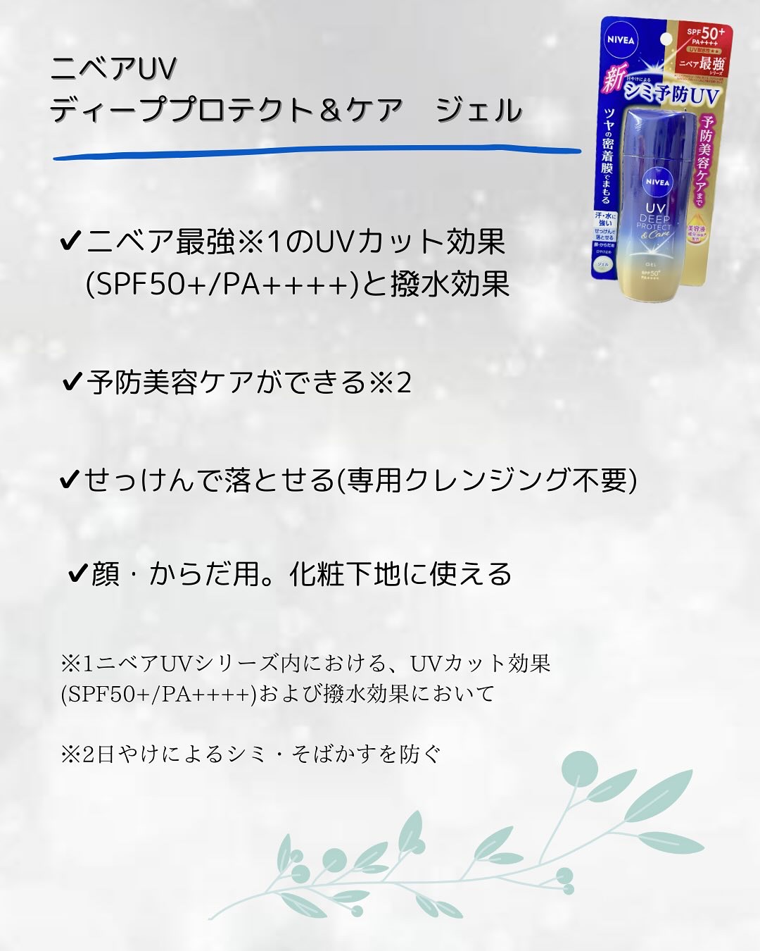 ニベア花王からいただきました。新日やけによるシミ予防UV✨「ニベアUVディーププロテクト&ケア」シリーズ初の改良新日やけによるシミ予防*1UV*1日やけによるシミ・そばかすを防ぐ全身にたっぷり使えるのびの良いジェル◆せっけんで落とせる(専用ク...