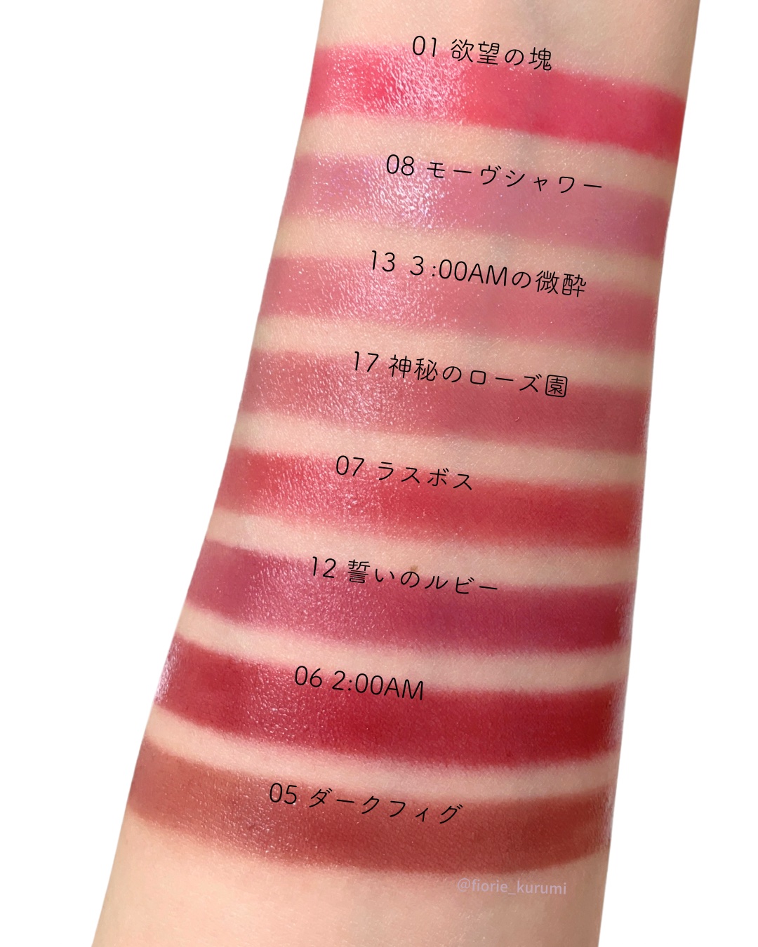 - <01 欲望の塊> テトライソステアリン酸ジペンタエリスリチル、トリ(カプリル酸/カプリン酸)グリセリル、オクチルドデカノール、ラウロイルグルタミン酸ジ(フィトステリル/オクチルドデシル)、ビスアルキル(C16-18)グリセリルウンデシルジメチコン、イソノナン酸イソトリデシル、水添ポリイソブテン、ラウロイルグルタミン酸ジ(オクチルドデシル/フィトステリル/ベヘニル)、パラフィン、合成ワックス、ダイマージリノール酸(フィトステリル/イソステアリル/セチル/ステアリル/ベヘニル)、マイクロクリスタリンワックス、水添マイクロクリスタリンワックス、ヒドロキシステアリン酸エチルヘキシル、トコフェロール、ホホバ種子油、オリーブ果実油、アーモンド油、(エチレン/プロピレン)コポリマー、ポリエチレン、ジメチコン、(+/-)(チタン/酸化チタン)焼結物、マイカ、ラウロイルアスパラギン酸Na、ラウロイルリシン、塩化亜鉛、酸化チタン、酸化鉄、水酸化Al、硫酸Ba、トリイソステアリン酸イソプロピルチタン、酸化スズ、ホウケイ酸(Ca/Al)、合成フルオロフロゴパイト、黄4、黄5、赤104(1)、赤201、赤202 <02 ピンクバナナ> テトライソステアリン酸ジペンタエリスリチル、トリ(カプリル酸/カプリン酸)グリセリル、オクチルドデカノール、ラウロイルグルタミン酸ジ(フィトステリル/オクチルドデシル)、ビスアルキル(C16-18)グリセリルウンデシルジメチコン、イソノナン酸イソトリデシル、水添ポリイソブテン、ラウロイルグルタミン酸ジ(オクチルドデシル/フィトステリル/ベヘニル)、パラフィン、合成ワックス、ダイマージリノール酸(フィトステリル/イソステアリル/セチル/ステアリル/ベヘニル)、マイクロクリスタリンワックス、水添マイクロクリスタリンワックス、ヒドロキシステアリン酸エチルヘキシル、トコフェロール、ホホバ種子油、オリーブ果実油、アーモンド油、(エチレン/プロピレン)コポリマー、ポリエチレン、ジメチコン、(+/-)(チタン/酸化チタン)焼結物、マイカ、ラウロイルアスパラギン酸Na、ラウロイルリシン、塩化亜鉛、酸化チタン、酸化鉄、水酸化Al、硫酸Ba、トリイソステアリン酸イソプロピルチタン、酸化スズ、ホウケイ酸(Ca/Al)、合成フルオロフロゴパイト、黄4、黄5、赤104(1)、赤201、赤202 <03 陽炎> テトライソステアリン酸ジペンタエリスリチル、トリ(カプリル酸/カプリン酸)グリセリル、オクチルドデカノール、ラウロイルグルタミン酸ジ(フィトステリル/オクチルドデシル)、ビスアルキル(C16-18)グリセリルウンデシルジメチコン、イソノナン酸イソトリデシル、水添ポリイソブテン、ラウロイルグルタミン酸ジ(オクチルドデシル/フィトステリル/ベヘニル)、パラフィン、合成ワックス、ダイマージリノール酸(フィトステリル/イソステアリル/セチル/ステアリル/ベヘニル)、マイクロクリスタリンワックス、水添マイクロクリスタリンワックス、ヒドロキシステアリン酸エチルヘキシル、トコフェロール、ホホバ種子油、オリーブ果実油、アーモンド油、(エチレン/プロピレン)コポリマー、ポリエチレン、ジメチコン、(+/-)(チタン/酸化チタン)焼結物、マイカ、ラウロイルアスパラギン酸Na、ラウロイルリシン、塩化亜鉛、酸化チタン、酸化鉄、水酸化Al、硫酸Ba、トリイソステアリン酸イソプロピルチタン、酸化スズ、ホウケイ酸(Ca/Al)、合成フルオロフロゴパイト、黄4、黄5、赤104(1)、赤201、赤202 <04 パンプキンワイン> テトライソステアリン酸ジペンタエリスリチル、トリ(カプリル酸/カプリン酸)グリセリル、オクチルドデカノール、ラウロイルグルタミン酸ジ(フィトステリル/オクチルドデシル)、ビスアルキル(C16-18)グリセリルウンデシルジメチコン、イソノナン酸イソトリデシル、水添ポリイソブテン、ラウロイルグルタミン酸ジ(オクチルドデシル/フィトステリル/ベヘニル)、パラフィン、合成ワックス、ダイマージリノール酸(フィトステリル/イソステアリル/セチル/ステアリル/ベヘニル)、マイクロクリスタリンワックス、水添マイクロクリスタリンワックス、ヒドロキシステアリン酸エチルヘキシル、トコフェロール、ホホバ種子油、オリーブ果実油、アーモンド油、(エチレン/プロピレン)コポリマー、ポリエチレン、ジメチコン、(+/-)(チタン/酸化チタン)焼結物、マイカ、ラウロイルアスパラギン酸Na、ラウロイルリシン、塩化亜鉛、酸化チタン、酸化鉄、水酸化Al、硫酸Ba、トリイソステアリン酸イソプロピルチタン、酸化スズ、ホウケイ酸(Ca/Al)、合成フルオロフロゴパイト、黄4、黄5、赤104(1)、赤201、赤202 <05 ダークフィグ> テトライソステアリン酸ジペンタエリスリチル、トリ(カプリル酸/カプリン酸)グリセリル、オクチルドデカノール、ラウロイルグルタミン酸ジ(フィトステリル/オクチルドデシル)、ビスアルキル(C16-18)グリセリルウンデシルジメチコン、イソノナン酸イソトリデシル、水添ポリイソブテン、ラウロイルグルタミン酸ジ(オクチルドデシル/フィトステリル/ベヘニル)、