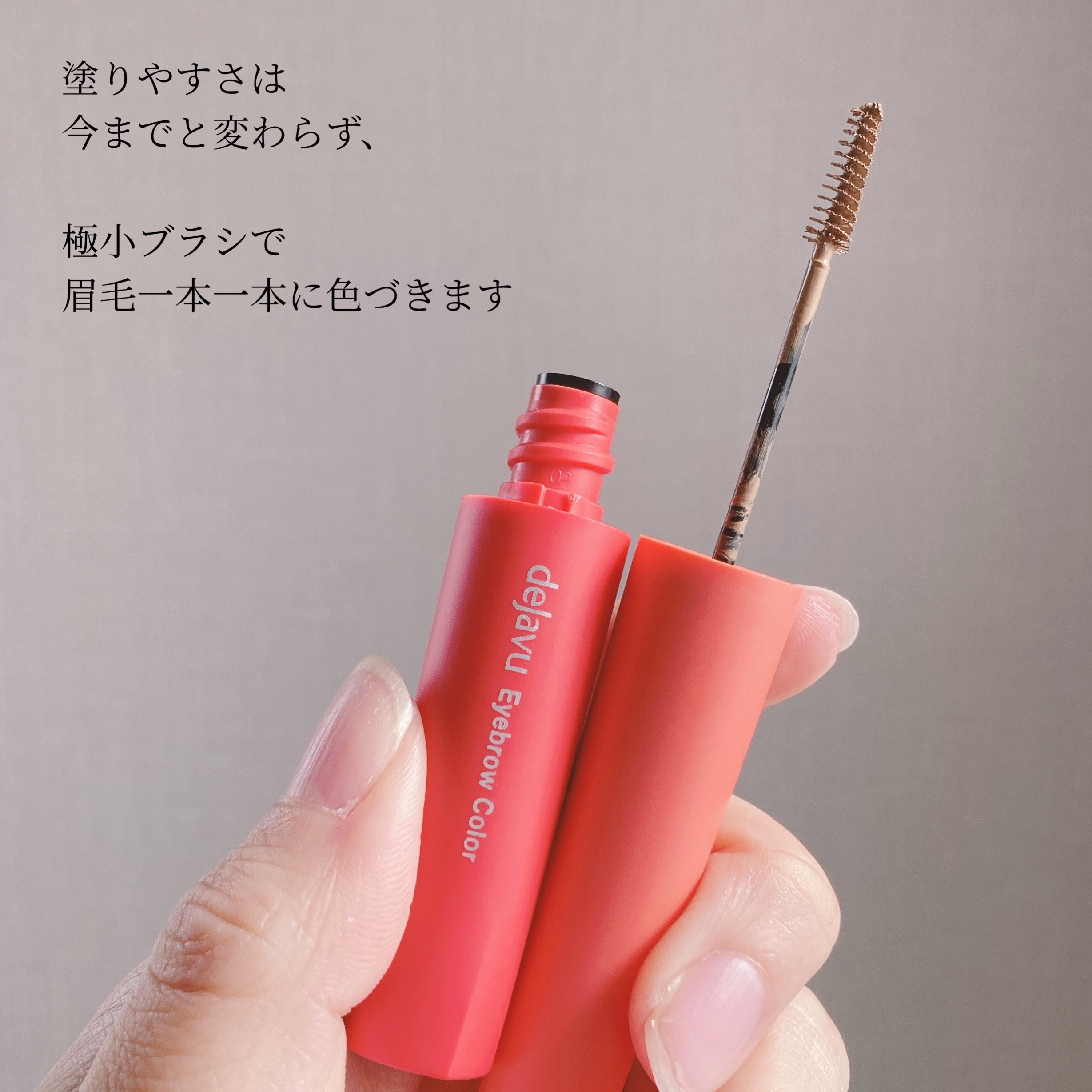 - \\25年3月定番新色モカグレージュ発売// 「フィルム眉カラー」なら眉の印象を自然にやわらげ、ふんわり質感の垢抜け眉に! 1.塗りやすい極小ブラシ ・ 先端直径3mmで、地肌に液がつきにくく根元から色づける ・余分な液がつかない設計で、ティッシュオフ不要 2.眉専用フィルム液 ・眉毛1本1本にキレイに色付き、自眉の黒さをやわらげる ・タバになったり、パリッと固まったりせず、まるで自眉のような仕上がり ・皮脂・汗・こすれに強いのにお湯で簡単オフ (※2025年9月以降、商品パッケージをリニューアル。) デジャヴュ アイブロウカラー
