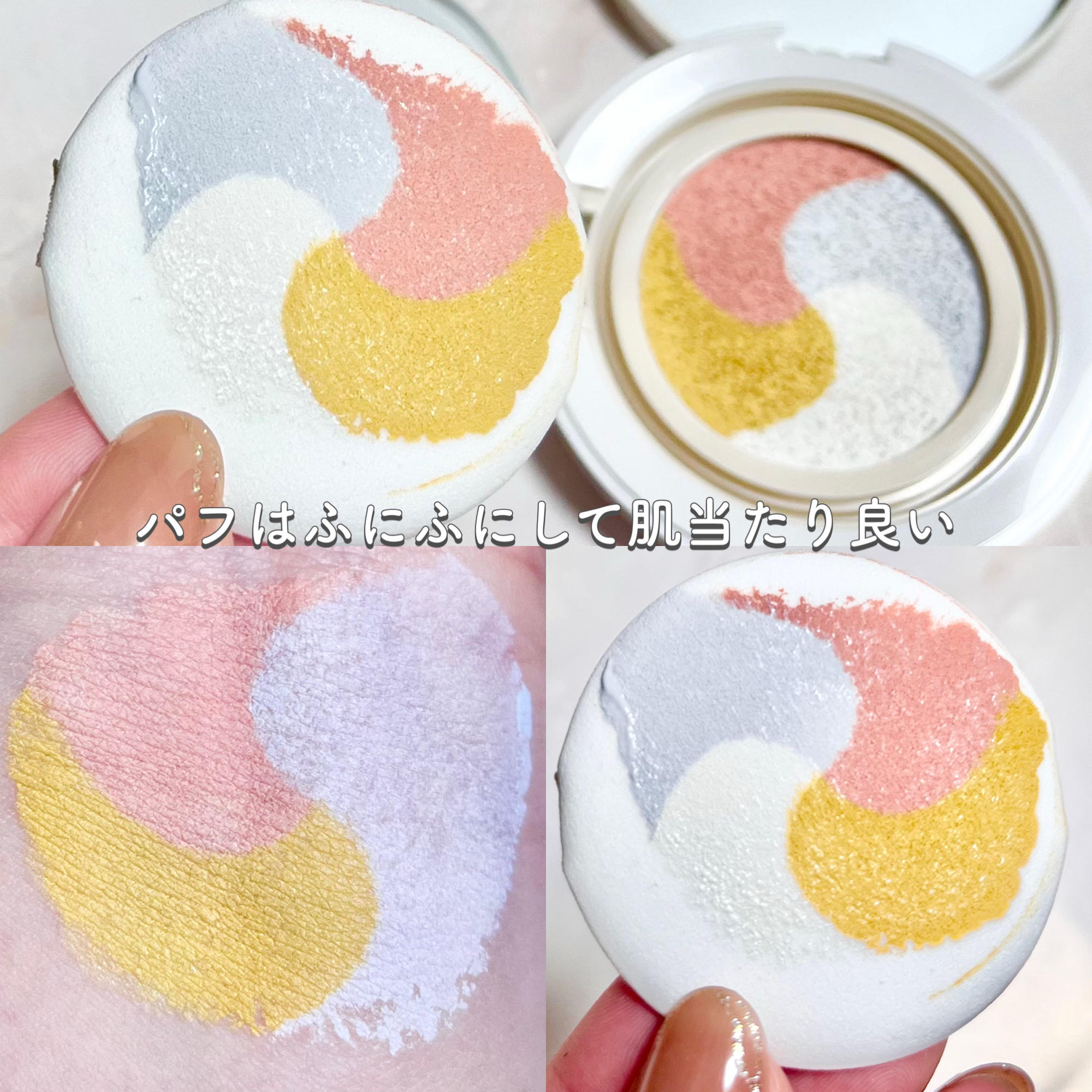 4色が重なる虹色シアーファンデ😳ドキドキしながらパフで馴染ませていったらほんとにお肌に馴染んでいきましたとさ😍すごーい👏 ツヤ感は、セミツヤ?くらいのかんじだなと思いました。あと私はそこまで薄膜には感じなかったかな。 仕上げに水色だけ取って頬に乗せたり、ホワイトだけとってハイライト使いしたり、色んな使い方があって面白いファンデーションですね🫶☺️