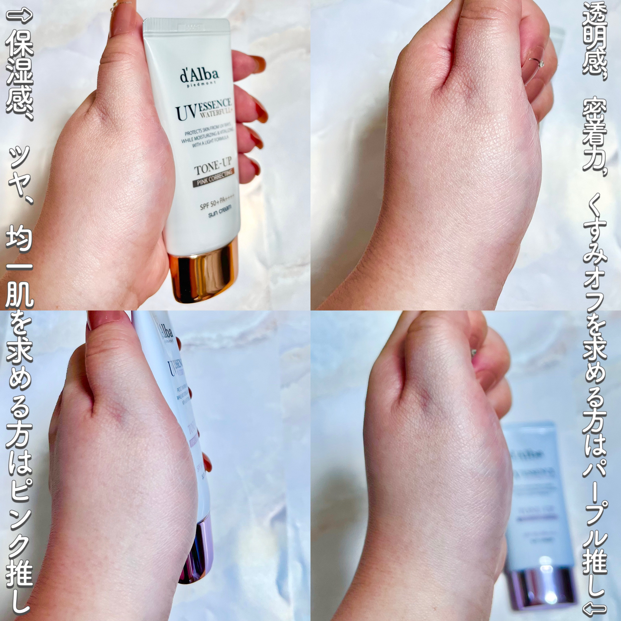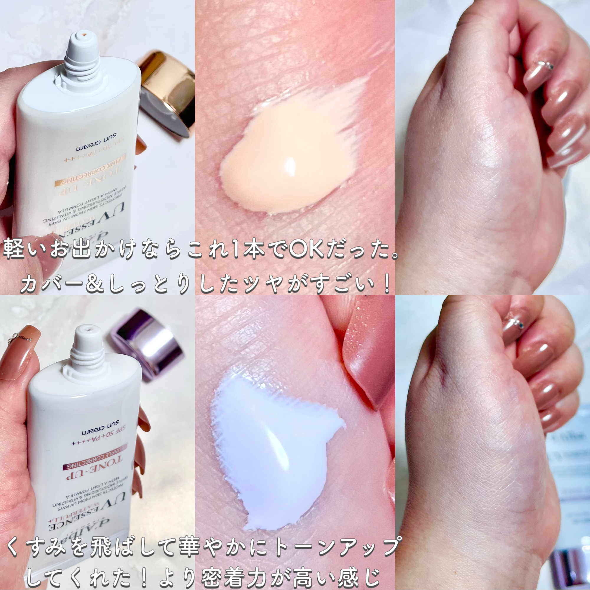 素肌のような自然なトーンアップでツヤ感を与え、ピンクに輝く血色感ある肌に導いてくれる✨️ ツヤ感がうまれる仕上がりが気に入っています。 補色のパープルで華やかでいきいきした透明感肌にブルべ補正トーンアップしてくれます。 私はピンクの日焼け止めを最初は使っていたけど、今は黄ぐすみが気になる目の下あたりに部分的に補正する目的でパープルを重ね付けする使い方が気に入っています。 パーソナルカラーを気にするのはベース時点ではあまり気にせず、なりたい肌に合わせてベースを作るのがいいみたいです。