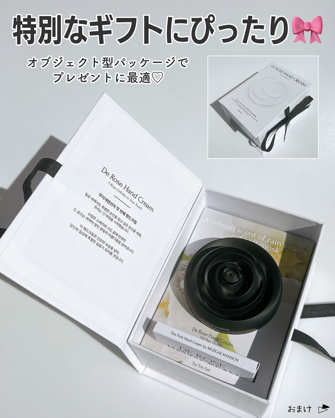 ムジゲマンション初のオブジェハンドクリーム🌹 ✅サラッとしたベタつきのないテクスチャー ✅保湿成分20%配合でしっとりとした保湿感 ✅使った後の手元がほのかに香る 今回使用したのは003 Pear Mirage 爽やかさと大人っぽさが感じられる香りだったよ♩ 黒バラハンドクリームなんて今まで見たことないし、オブジェと同じパッケージで、プレゼント用にも超おすすめ♡