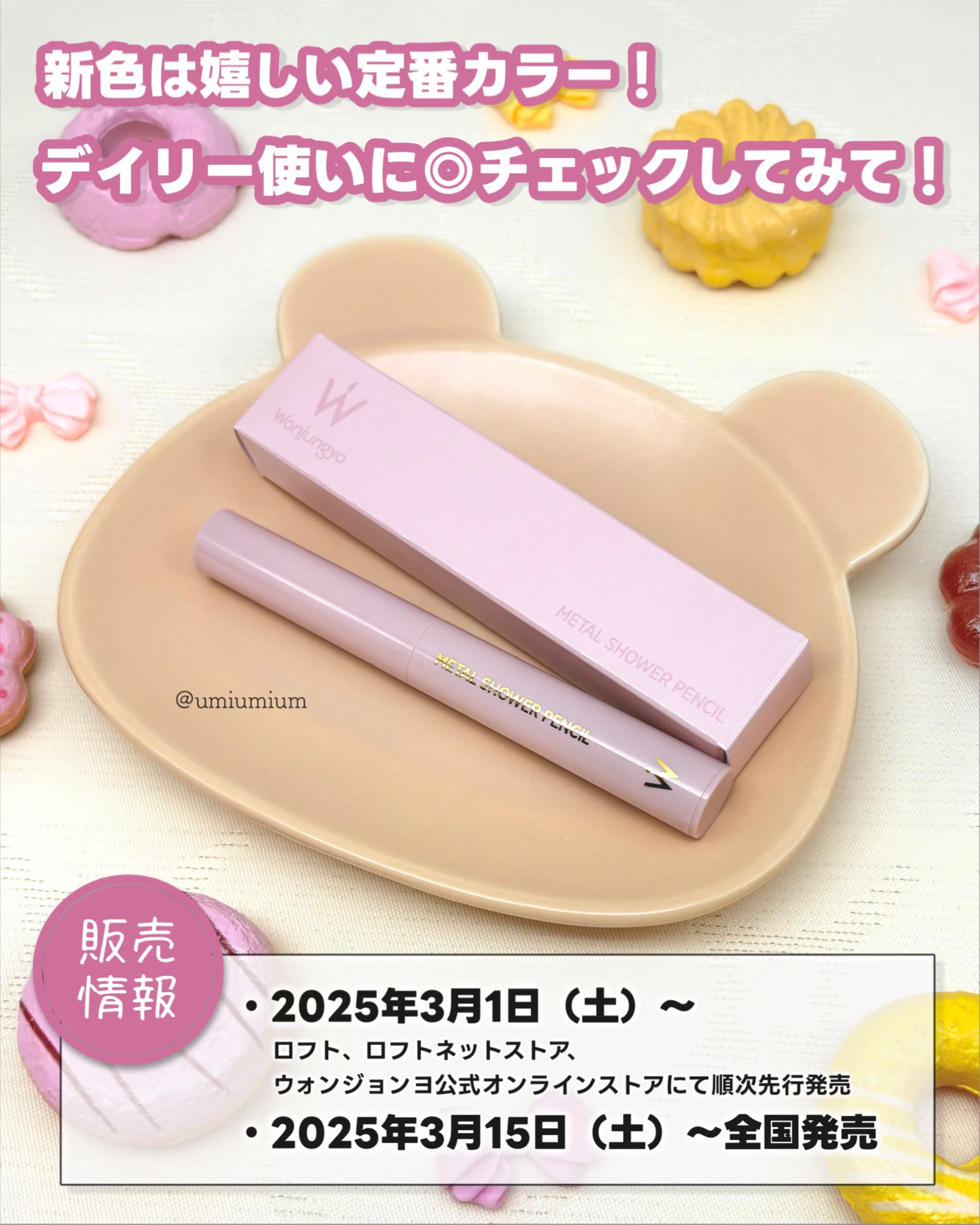 今までで1番ナチュラル!誰でも使いやすい毎日コスメ👀✨ ウォンジョンヨの代名詞!涙袋メイクのアイテム メタルシャワーペンシルから新色【07リコッタベージュ】が登場💓 黄みにも青みにも寄っていないニュートラルカラー! メイク初心者さんにも使いやすいアイテム👼🏻 3/1(土)先行発売 ウォンジョンヨ公式オンラインストア、ロフト(一部店舗を除く)、ロフトネットストア