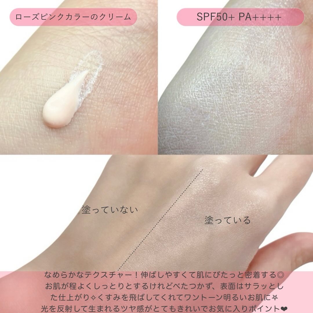 - 敏感肌用スキンケアUV No.1*が、 皮膚科学にも基づいてさらに進化。トーンアップUV ローズ+ 全部、はね返す 。 光、くすみ*1、紫外線も。 生ツヤ肌トーンアップ*2UV ●光の美しい反射に、新 グロウピンク設計 反射力アップ*2 + 黄ぐすみ補正*2 なめらかなツヤ肌*2に。 ●日中くすみ*1リスクに、新 スキンケア膜日焼け止め 整肌成分:ビタミンC誘導体*3 + ビタミンE *4 配合 なめらかケア成分:LHA *5 配合 塗るたび肌が整い、明るくつるんとした肌印象に。 ●紫外線対策に、新 UVフィルター設計*6 SPF50+・PA++++ 8種*6のフィルターで、ロングUVAを含む紫外線をしっかり防御。 ●皮膚科医の協力のもとテスト済み*7 ●ニキビのもとになりにくい処方*8 ●アジア人の敏感な肌でテスト済み*7 ●花粉など外的刺激から肌を守る ●石けん・洗顔料でオフ ●無香料 ●パラベンフリー *1 乾燥による *2 メイクアップ効果による。 *3 アスコルビルグルコシド(製品の抗酸化剤・整肌成分) *4 トコフェロール(製品の抗酸化剤・整肌成分) *5 カプリロイルサリチル酸(角質柔軟成分) *6 酸化チタン(紫外線散乱剤)、エチルヘキシルトリアゾン、ビスエチルヘキシルオキシフェノールメトキシフェニルトリアジン、t-ブチルメトキシジベンゾイルメタン、テレフタリリデンジカンフルスルホン酸、フェニルベンズイミダゾールスルホン酸、ドロメトリゾールトリシロキサン、ジエチルアミノヒドロキシベンゾイル安息香酸ヘキシル(全て、紫外線吸収剤) *7 すべての人に肌トラブルがおきないわけではありません。 *8 すべての人にニキビのもとができないわけではありません。