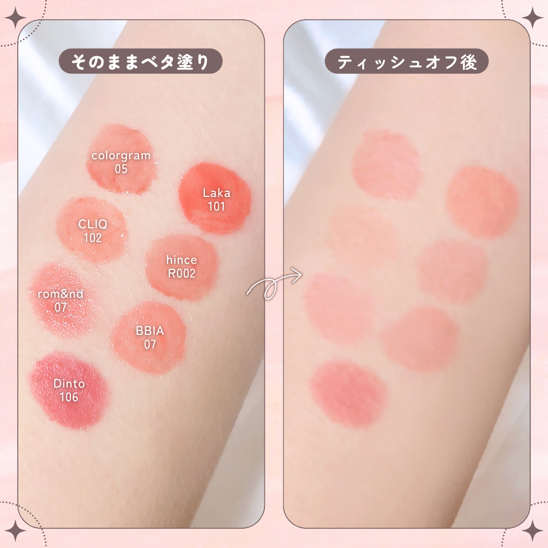 | 青みピンクで色白の方はとっても肌に馴染みやすいカラーだと思います◎ ツヤ感のある仕上がりになるリップティントで、色持ちも十分でした。 | 詳細を見る | |||