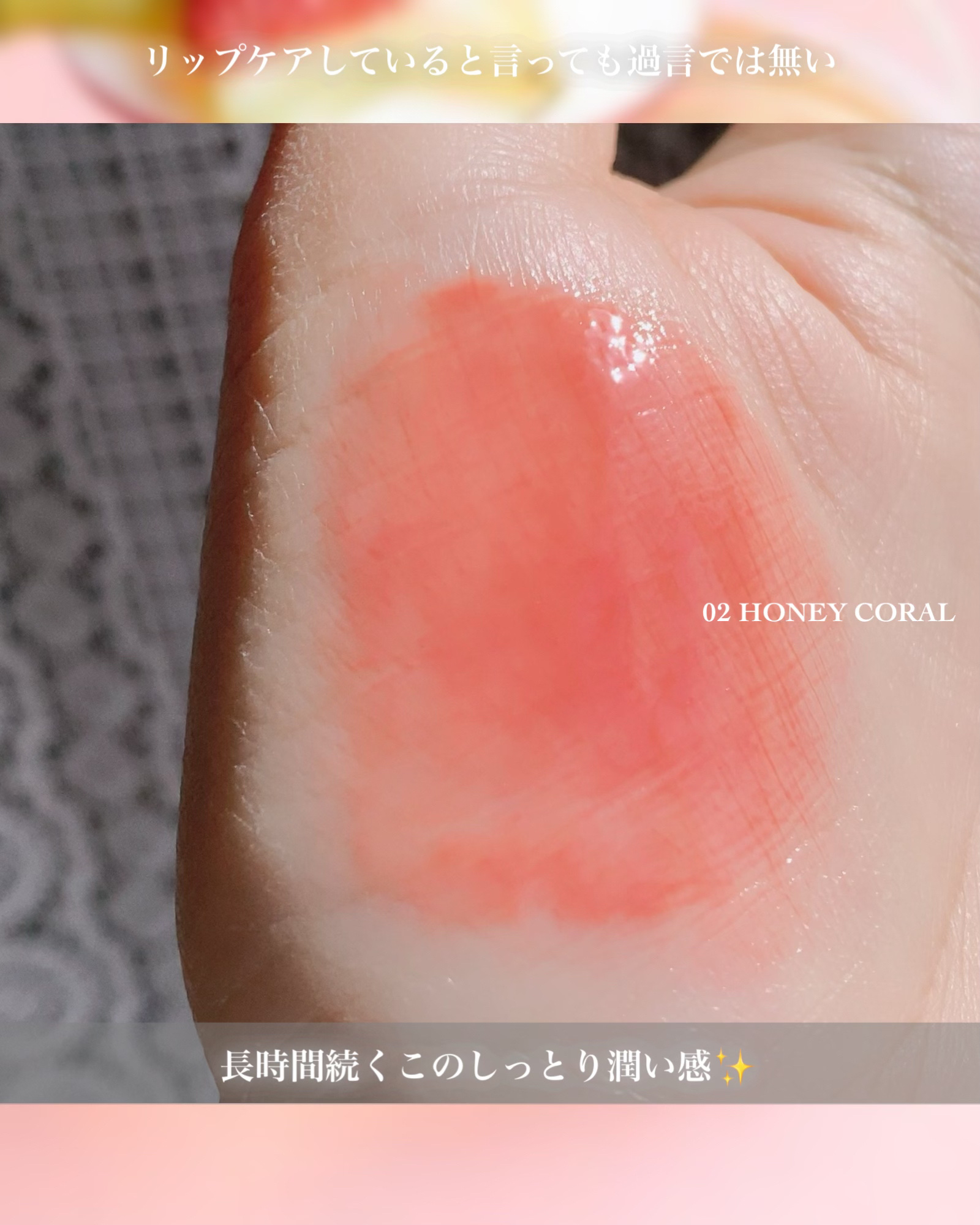 - <01 ロウ・ローズデュー> リンゴ酸ジイソステアリル、トリ(カプリル/カプリン酸)グリセリル、水添ポリイソブテン、ビスジグリセリルポリアシルアジペート-2、ダイマージリノール酸(フィトステリル/イソステアリル/セチル/ステアリル/ベヘニル)、ダイマージリノール酸ダイマージリノレイルビス(ベヘニル/イソステアリル/フィトステリル)、マイクロクリスタリンワックス、トリイソステアリン酸ポリグリセリル-2、(ヒマシ油/IPDI)コポリマー、合成ワックス、1,2-ヘキサンジオール、セスキオレイン酸ソルビタン、酸化チタン、ポリヒドロキシステアリン酸、(エチレン/プロピレン)コポリマー、酸化鉄、レシチン、香料、エチルヘキシルグリセリン、赤202、黄5、パルミチン酸エチルヘキシル、イソステアリン酸、ミリスチン酸イソプロピル、ポリリシノレイン酸ポリグリセリル-3、スクワラン、カカオ脂、水、トコフェロール、BHT、ヒアルロン酸Na、加水分解ヒアルロン酸、アセチルヒアルロン酸Na <02 ハニーコーラル> リンゴ酸ジイソステアリル、トリ(カプリル/カプリン酸)グリセリル、水添ポリイソブテン、ビスジグリセリルポリアシルアジペート-2、ダイマージリノール酸(フィトステリル/イソステアリル/セチル/ステアリル/ベヘニル)、ダイマージリノール酸ダイマージリノレイルビス(ベヘニル/イソステアリル/フィトステリル)、マイクロクリスタリンワックス、(ヒマシ油/IPDI)コポリマー、合成ワックス、トリイソステアリン酸ポリグリセリル-2、1,2-ヘキサンジオール、セスキオレイン酸ソルビタン、酸化チタン、ポリヒドロキシステアリン酸、(エチレン/プロピレン)コポリマー、黄5、レシチン、香料、エチルヘキシルグリセリン、パルミチン酸エチルヘキシル、イソステアリン酸、ミリスチン酸イソプロピル、赤202、ポリリシノレイン酸ポリグリセリル-3、黄4、スクワラン、カカオ脂、水、トコフェロール、BHT、ヒアルロン酸Na、加水分解ヒアルロン酸、アセチルヒアルロン酸Na <03 バニーピンク> リンゴ酸ジイソステアリル、トリ(カプリル/カプリン酸)グリセリル、水添ポリイソブテン、ビスジグリセリルポリアシルアジペート-2、ダイマージリノール酸(フィトステリル/イソステアリル/セチル/ステアリル/ベヘニル)、ダイマージリノール酸ダイマージリノレイルビス(ベヘニル/イソステアリル/フィトステリル)、マイクロクリスタリンワックス、トリイソステアリン酸ポリグリセリル-2、(ヒマシ油/IPDI)コポリマー、合成ワックス、酸化チタン、1,2-ヘキサンジオール、セスキオレイン酸ソルビタン、ポリヒドロキシステアリン酸、(エチレン/プロピレン)コポリマー、黄5、レシチン、香料、エチルヘキシルグリセリン、パルミチン酸エチルヘキシル、イソステアリン酸、ミリスチン酸イソプロピル、赤202、赤231、ポリリシノレイン酸ポリグリセリル-3、スクワラン、カカオ脂、水、トコフェロール、BHT、ヒアルロン酸Na、加水分解ヒアルロン酸、アセチルヒアルロン酸Na <04 フィーバーデュー> リンゴ酸ジイソステアリル、トリ(カプリル/カプリン酸)グリセリル、水添ポリイソブテン、ビスジグリセリルポリアシルアジペート-2、ダイマージリノール酸(フィトステリル/イソステアリル/セチル/ステアリル/ベヘニル)、ダイマージリノール酸ダイマージリノレイルビス(ベヘニル/イソステアリル/フィトステリル)、マイクロクリスタリンワックス、(ヒマシ油/IPDI)コポリマー、合成ワックス、1,2-ヘキサンジオール、セスキオレイン酸ソルビタン、トリイソステアリン酸ポリグリセリル-2、ポリヒドロキシステアリン酸、(エチレン/プロピレン)コポリマー、黄5、酸化チタン、レシチン、香料、エチルヘキシルグリセリン、赤202、パルミチン酸エチルヘキシル、イソステアリン酸、ミリスチン酸イソプロピル、ポリリシノレイン酸ポリグリセリル-3、スクワラン、カカオ脂、水、トコフェロール、BHT、ヒアルロン酸Na、加水分解ヒアルロン酸、アセチルヒアルロン酸Na <05 ハグデュー> リンゴ酸ジイソステアリル、トリ(カプリル/カプリン酸)グリセリル、水添ポリイソブテン、ビスジグリセリルポリアシルアジペート-2、ダイマージリノール酸(フィトステリル/イソステアリル/セチル/ステアリル/ベヘニル)、ダイマージリノール酸ダイマージリノレイルビス(ベヘニル/イソステアリル/フィトステリル)、マイクロクリスタリンワックス、(ヒマシ油/IPDI)コポリマー、合成ワックス、1,2-ヘキサンジオール、セスキオレイン酸ソルビタン、トリイソステアリン酸ポリグリセリル-2、ポリヒドロキシステアリン酸、(エチレン/プロピレン)コポリマー、黄5、酸化チタン、レシチン、香料、エチルヘキシルグリセリン、赤202、パルミチン酸エチルヘキシル、イソステアリン酸、ミリスチン酸イソプロピル、ポリリシノレイン酸ポリグリセリル-3、スクワラン、カカオ脂、水、トコフェロール、BHT、ヒアルロン酸Na、加水分解ヒアルロン酸、アセチルヒアルロン酸Na <06 ジンジ