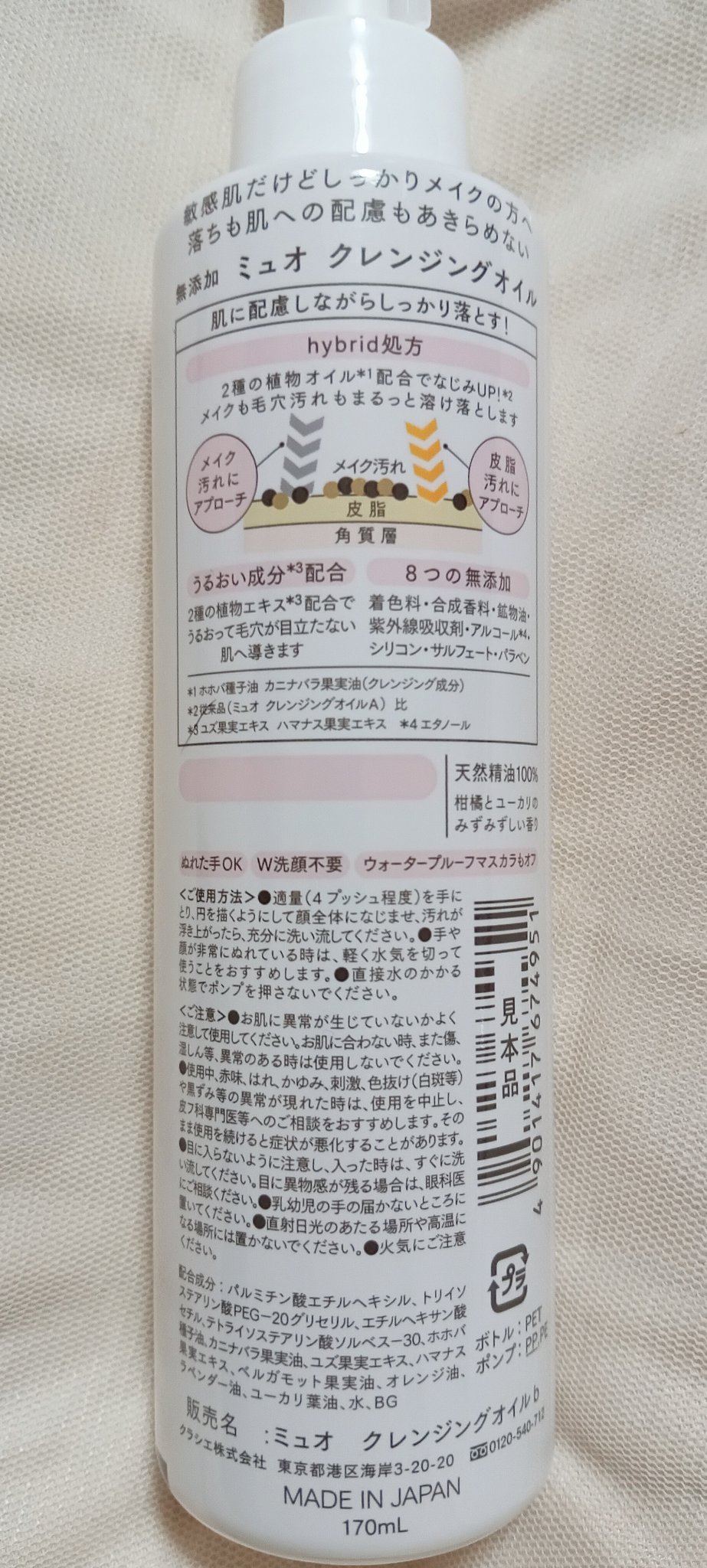 - ●敏感肌だけどしっかりメイクの方へ敏感肌のための落とすスキンケアシリーズ。 ●無添加:着色料・合成香料・鉱物油・紫外線吸収剤・アルコール*1・シリコン・サルフェート・パラベン不使用。 ●古い角質やメイク・皮脂になじみの良い植物オイル*2を配合したhybrid処方。 ●うるおい成分ユズ果実エキス・ハマナス果実エキス配合。 ●アレルギーテスト済み*3・敏感肌の方のご協力によるパッチテスト済み*4。 ●天然精油100% 柑橘とユーカリのみずみずしい香り。 ●肌に配慮しながら毛穴に入り込んだメイクや黒ずみ汚れまで落とし、毛穴の目立ちにくい肌へ導くクレンジングオイル。 ●ウォータープルーフマスカラもするっとオフ。 ●W洗顔不要。 ●まつエクOK。 ●濡れた手や顔でもお使いいただけます。 *1 エタノール *2【クレンジング成分】ホホバ種子油・カニナバラ果実油 *3 アレルギーテスト済み:全ての方にアレルギーが起こらないということではありません。 *4 パッチテスト済み:全ての方に皮フ刺激が起こらないということではありません。