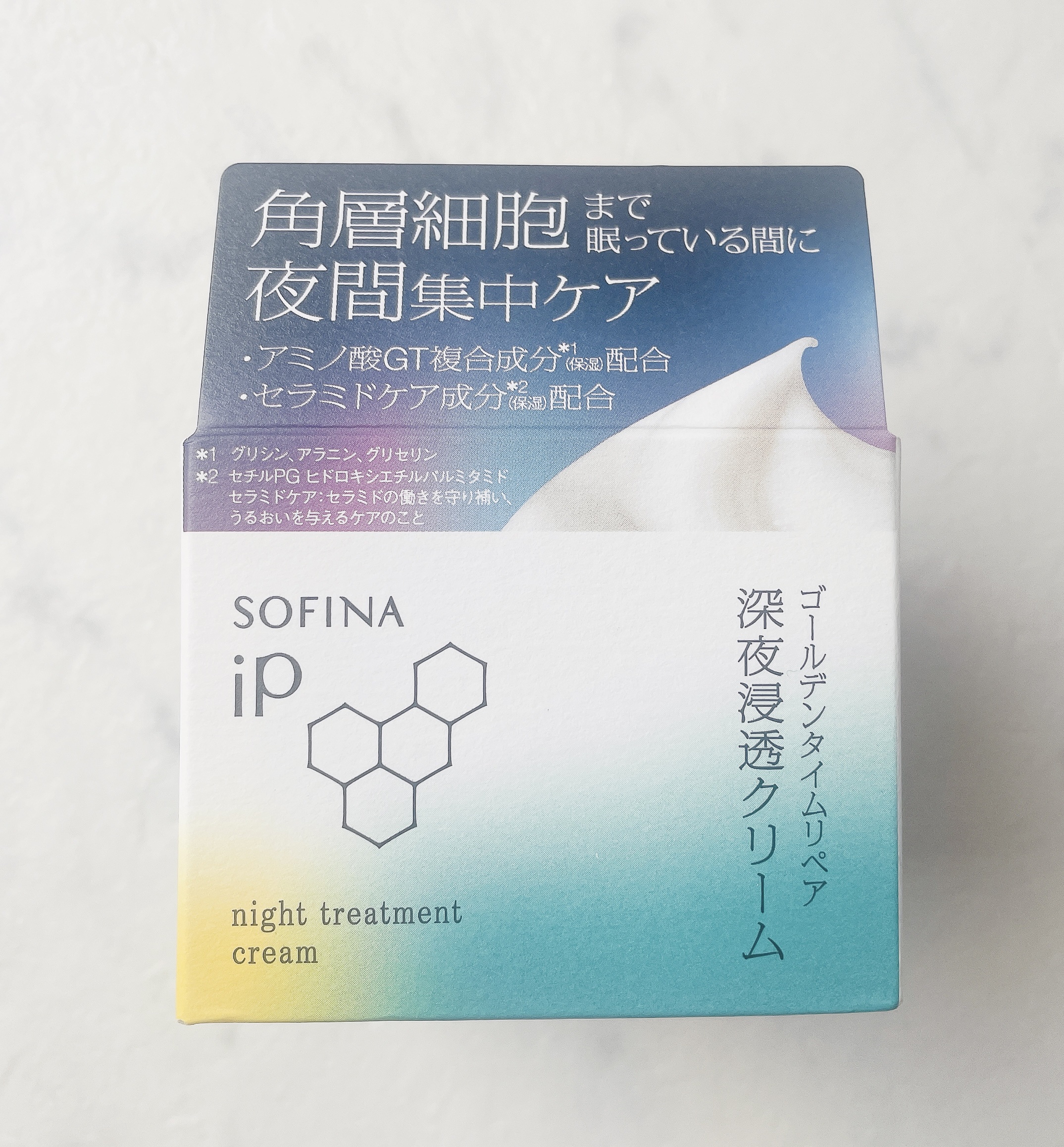 - 夜の過酷な乾燥ダメージに着目。 ゴールデンタイムの就寝中に、乾燥を防ぐ角層のバリア機能の働きを補う角層トリートメントGT処方。 角層細胞まで浸透し、夜の肌をうるおいで満たし続ける。翌朝も手触りが楽しみになるようなもっちりハリツヤ肌へ。 ○ツノが立つほど濃密なクリームが吸い込まれるように肌と一体化する使い心地 ○みずみずしいクリアフローラルエナジーの香り ○アミノ酸GT複合成分*1(保湿)配合 ○セラミドケア成分*2(保湿)配合 ○ケラトMF複合成分*3(保湿)配合 *1 グリシン、アラニン、グリセリン *2 セチルPGヒドロキシエチルパルミタミド セラミドケア:セラミドの働きを守り補い、うるおいを与えるケアのこと *3 アミジノプロリン、コハク酸ジグリコールグアニジン、メチルセリン