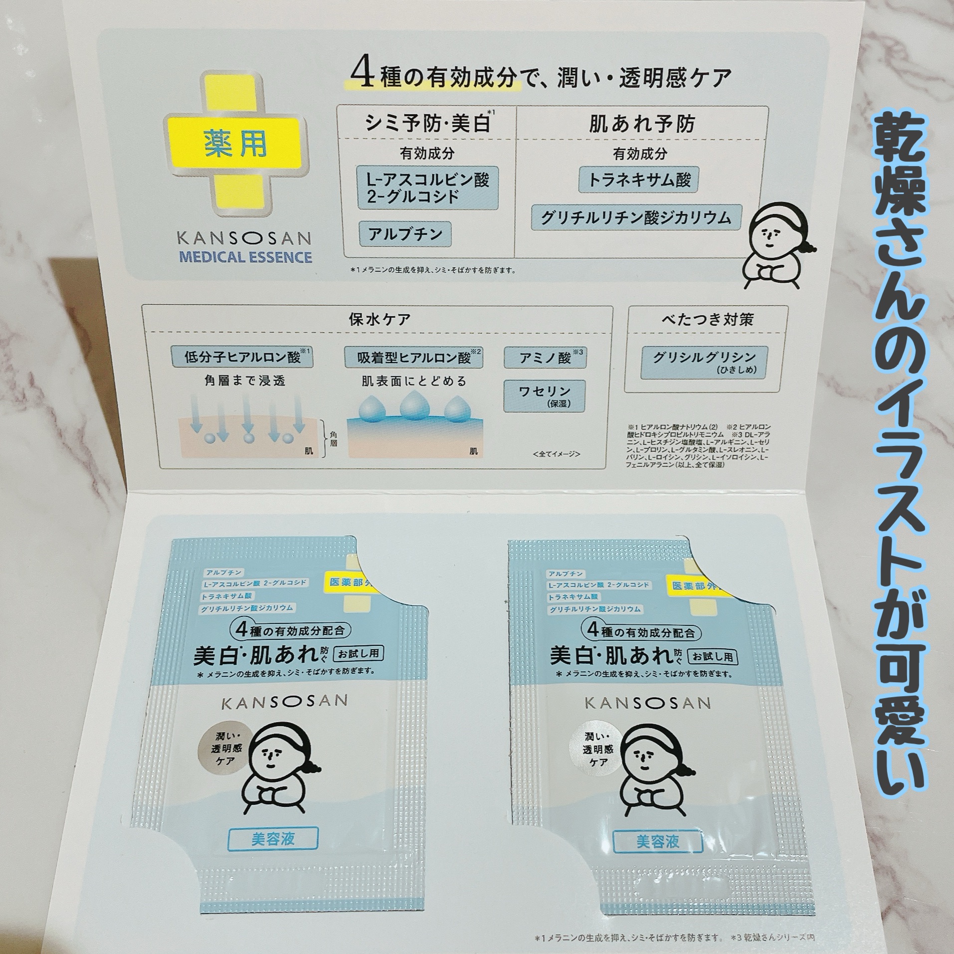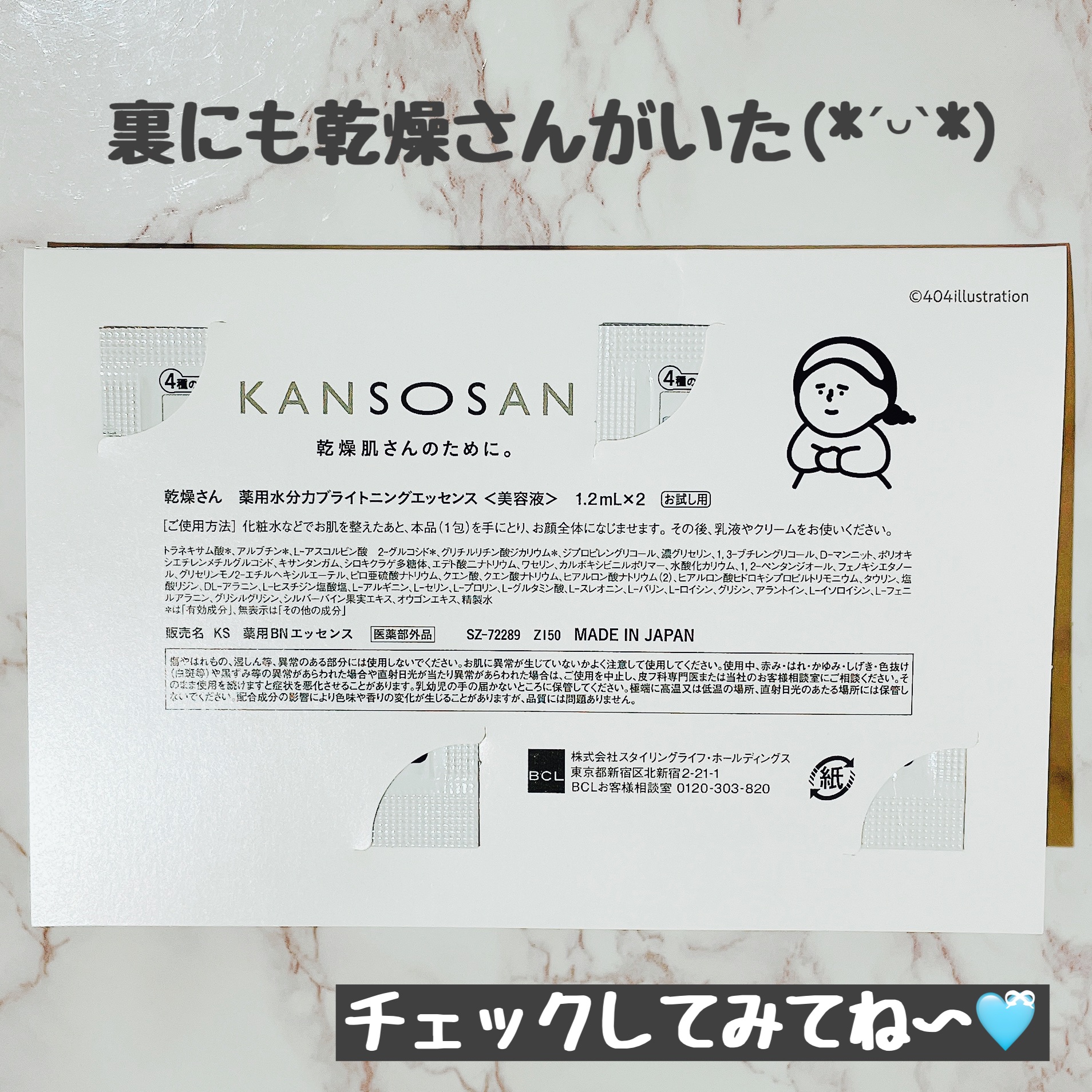 BeautyMeets企画でいただきました。#乾燥さん薬用水分力ブライトニングエッセンスサンプル2包透明で少しだけとろみのあるテクスチャーの美容液です。「乾燥さん」の商品初めて使いました。自分は混合肌だと思っているのですが、油っぽさに加えて乾...