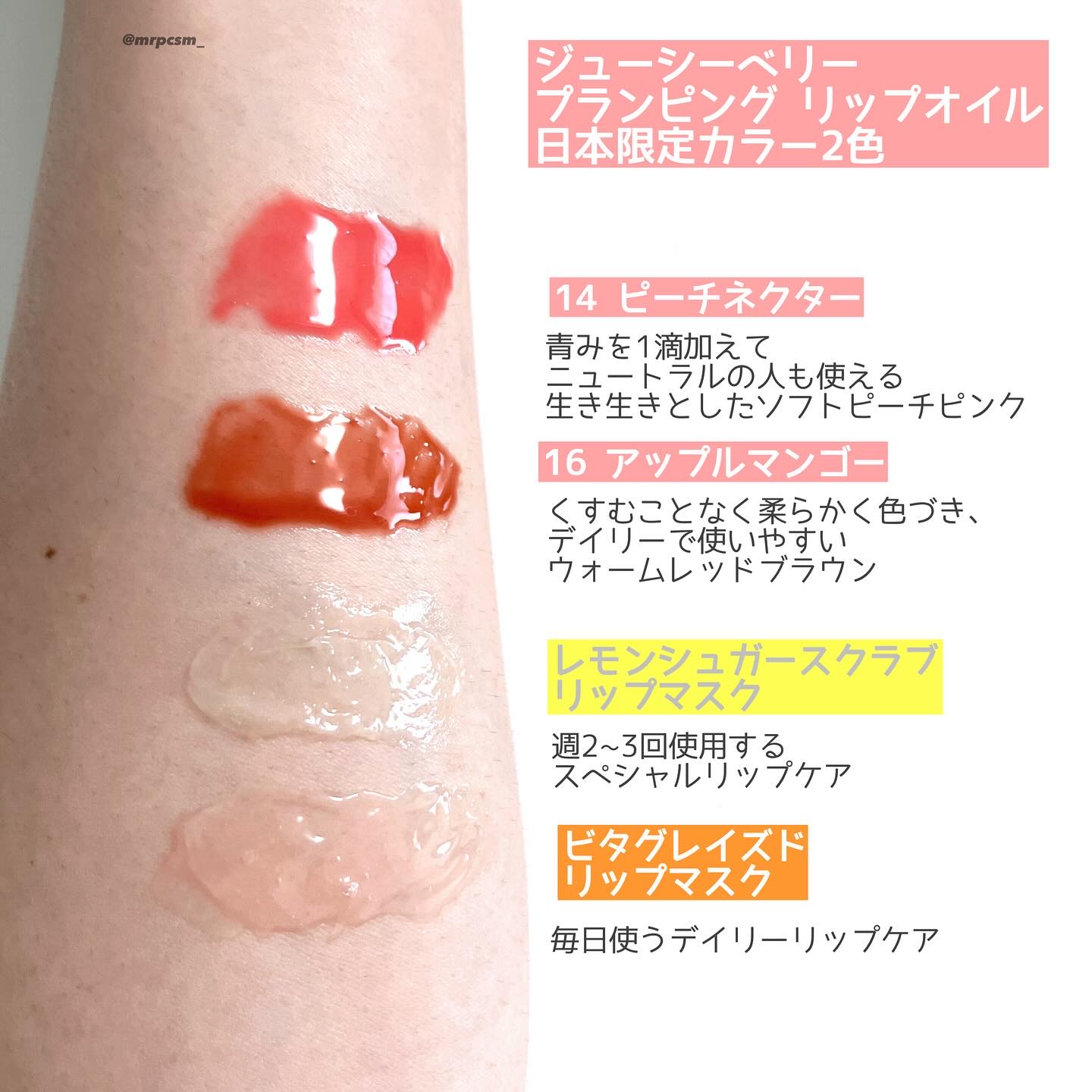 夜の間に唇の角質を落ち着かせるオーバーナイトリップマスクのビタグレーズドとレモンシュガースクラブと唇の角質や縦じわをカバーするプランピングリップオイル✨ 特にレモンシュガースクラブの爽やかなレモンの香りが私は好き🫶 オーバーナイトリップマスクの後にリップオイルを使うとつやつやつるん!とした可愛いリップが作れるよ😍