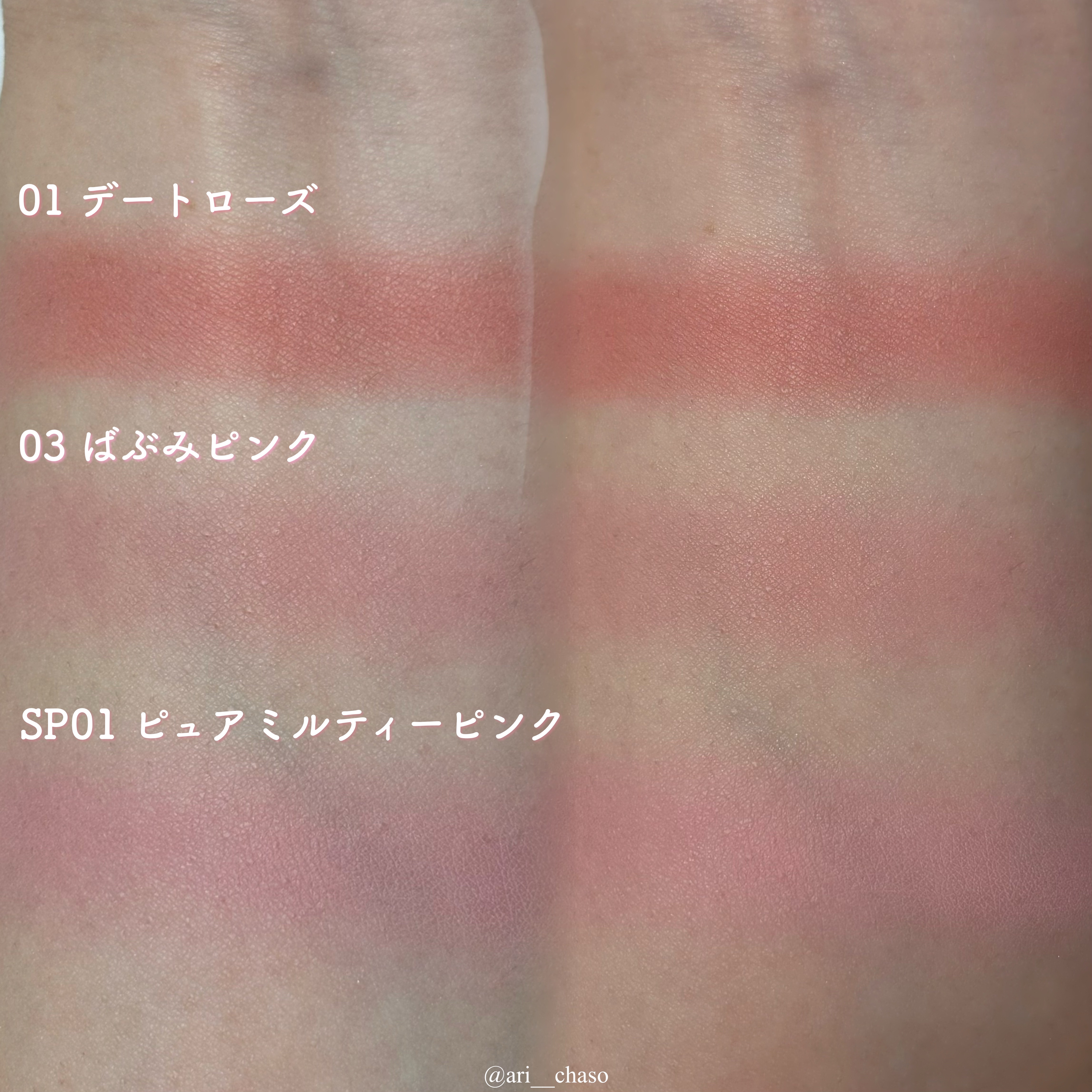 - ぽわんっと色付くなじみチーク <ポイント> ◆肌なじみの良いサラサラパウダー 一気に付きすぎることなくチーク初心者でも使いやすい! ◆程よいシアーな発色 単色使いはもちろん、レイヤリングしやすくグラデーションなどの調節も簡単。 ◆自然な血色感カラー ぽわん、と内側から上気したような自然な血色感を演出。 02 ピュアビスケット ビスケットのような柔らかいベージュカラー 03 ばぶみピンク ミルキーでやわらかなベビーピンク <04 ピュアミルティーピンク(旧:SP01 ピュアミルティーピンク)> 2025/9/19~定番化