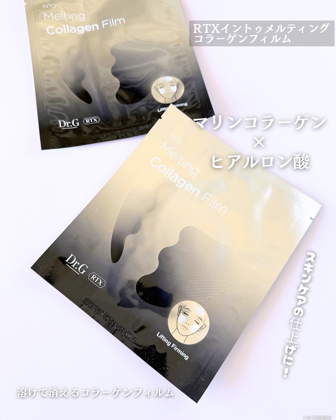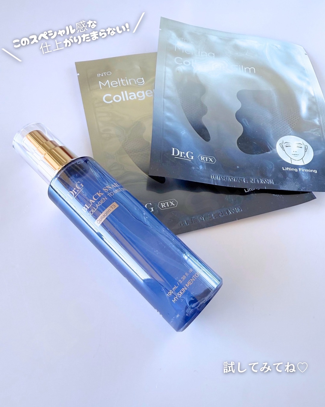 RTXイントゥメルティングコラーゲンフィルムとブラックスネイルコラーゲントゥーミストセラムを使ってみたよ! 人気成分ブラックスネイルに加え人が持つコラーゲンに極めて近いT3コラーゲンでハリ弾力アップ⤴︎ 乾いたフィルムが水分に触れることで肌に貼りつき、ミストをふきかけることでより密着
