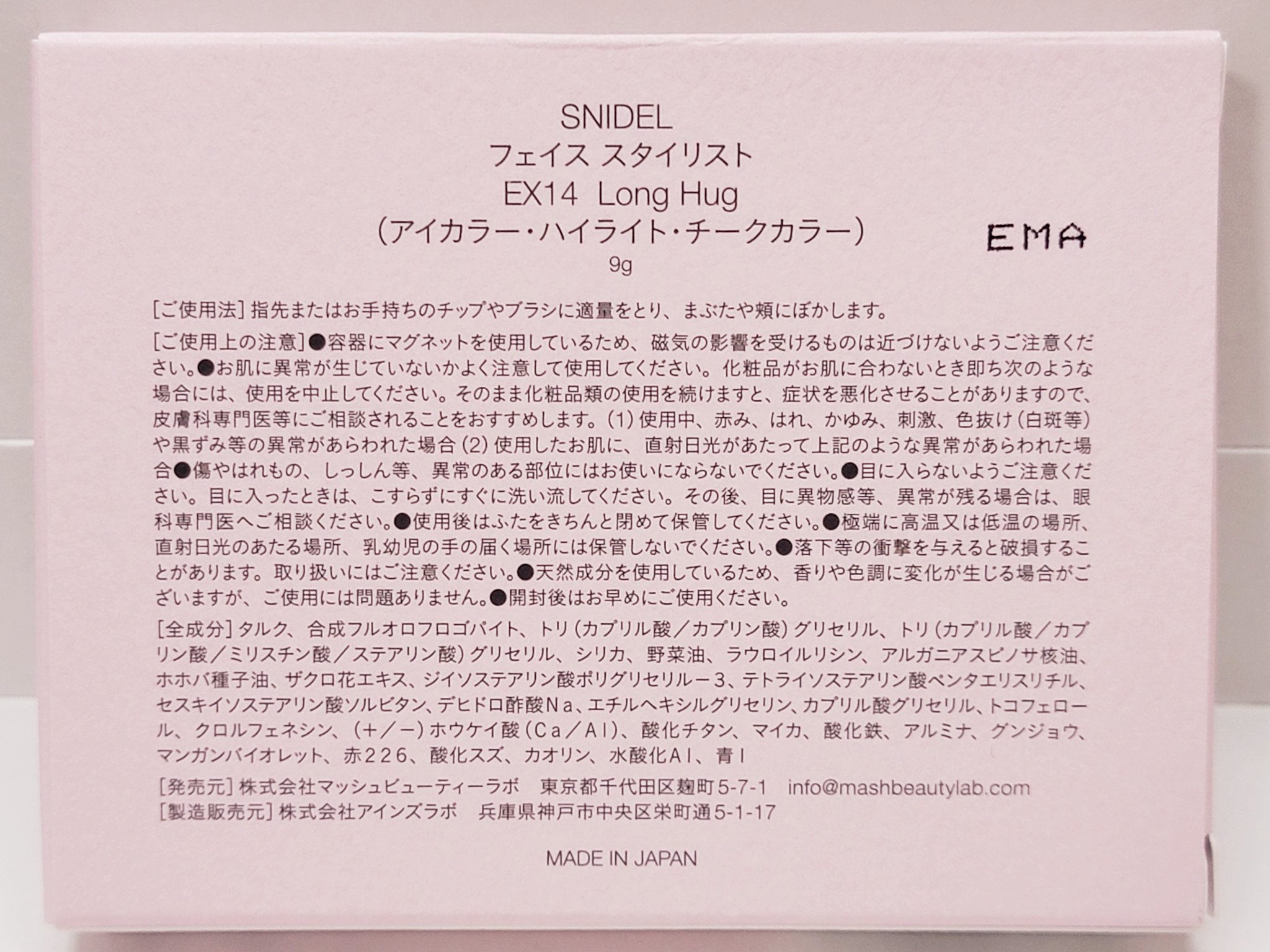 - <01 Iconic Beige> 合成フルオロフロゴパイト、タルク、マイカ、イソステアリン酸ポリグリセリル-2、トリ(カプリル酸/カプリン酸)グリセリル、シリカ、ダイマージリノール酸(フィトステリル/イソステアリル/セチル/ステアリル/ベヘニル)、アルガニアスピノサ核油、ホホバ種子油、ザクロ花エキス、ジイソステアリン酸ポリグリセリル-3、セスキイソステアリン酸ソルビタン、ラウロイルリシン、デヒドロ酢酸Na、カプリル酸グリセリル、エチルヘキシルグリセリン、トコフェロール、クロルフェネシン、ホウケイ酸(Ca/Al)、酸化チタン、ホウケイ酸(Ca/チタン)、酸化スズ、酸化鉄、銀 <02 Angel's Ladder> タルク、合成フルオロフロゴパイト、イソステアリン酸ポリグリセリル-2、ラウロイルリシン、トリ(カプリル酸/カプリン酸)グリセリル、ダイマージリノール酸(フィトステリル/イソステアリル/セチル/ステアリル/ベヘニル)、アルガニアスピノサ核油、ホホバ種子油、ザクロ花エキス、ジイソステアリン酸ポリグリセリル-3、セスキイソステアリン酸ソルビタン、デヒドロ酢酸Na、カプリル酸グリセリル、エチルヘキシルグリセリン、トコフェロール、クロルフェネシン、ホウケイ酸(Ca/Al)、マイカ、酸化チタン、シリカ、酸化スズ、酸化鉄 <EX10 Romantic Dreamer> タルク、トリ(カプリル酸/カプリン酸)グリセリル、イソステアリン酸ポリグリセリル-2、ラウロイルリシン、ダイマージリノール酸(フィトステリル/イソステアリル/セチル/ステアリル/ベヘニル)、シリカ、アルガニアスピノサ核油、ホホバ種子油、ザクロ花エキス、ジイソステアリン酸ポリグリセリル-3、セスキイソステアリン酸ソルビタン、トリ(カプリル酸/カプリン酸/ミリスチン酸/ステアリン酸)グリセリル、デヒドロ酢酸Na、カプリル酸グリセリル、エチルヘキシルグリセリン、トコフェロール、クロルフェネシン、合成フルオロフロゴパイト、マイカ、ホウケイ酸(Ca/Al)、酸化チタン、酸化鉄、Al、ホウケイ酸(Ca/チタン)、グンジョウ、銀、酸化スズ、水酸化Al、カオリン、金、赤202
