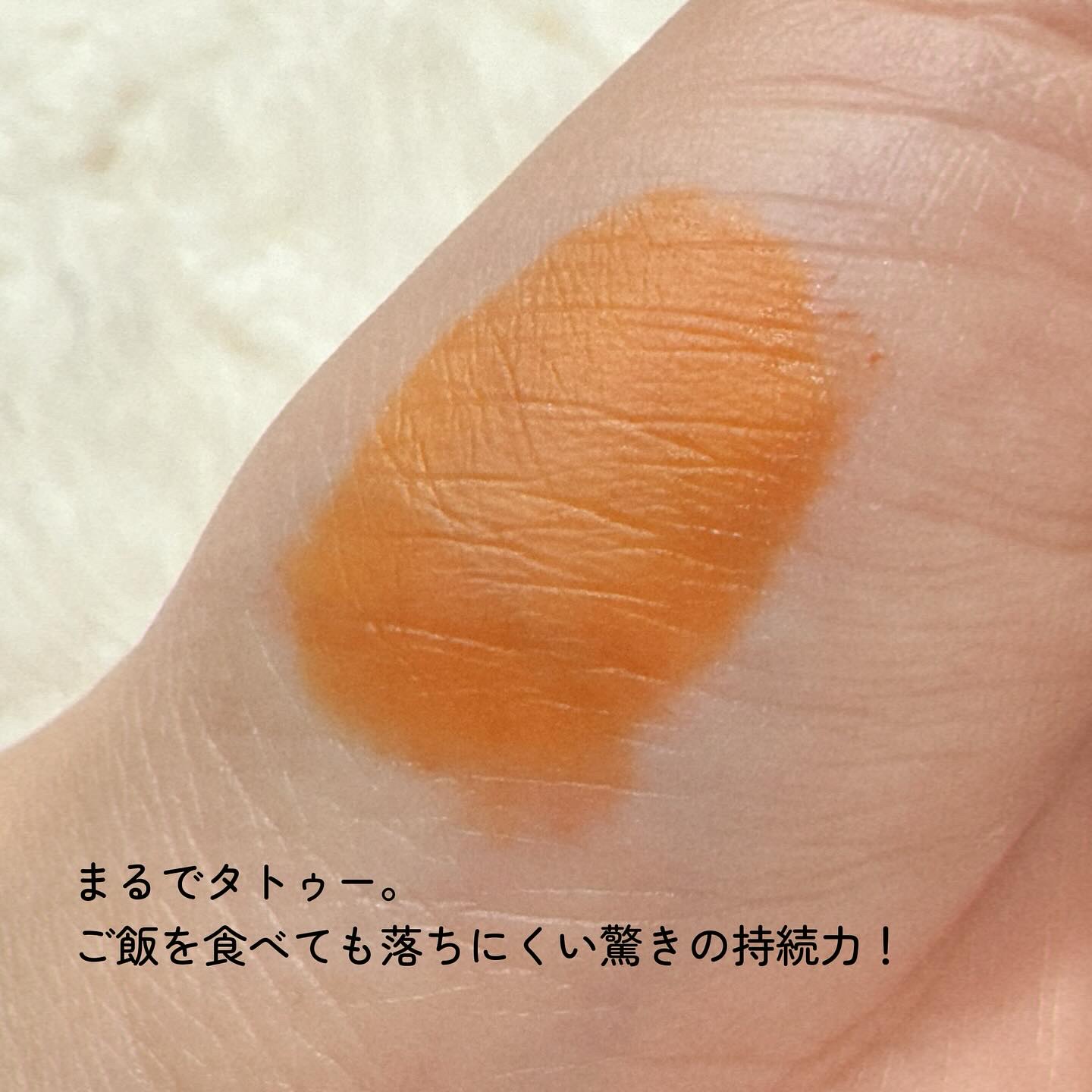 塗布して15分くらい乾かしたらペリっと剥がして定着させるリップティーク✨ 定着させた後は本当に全然落ちなかった! 写真は003 BLUNTOで春らしい可愛いオレンジ🧡