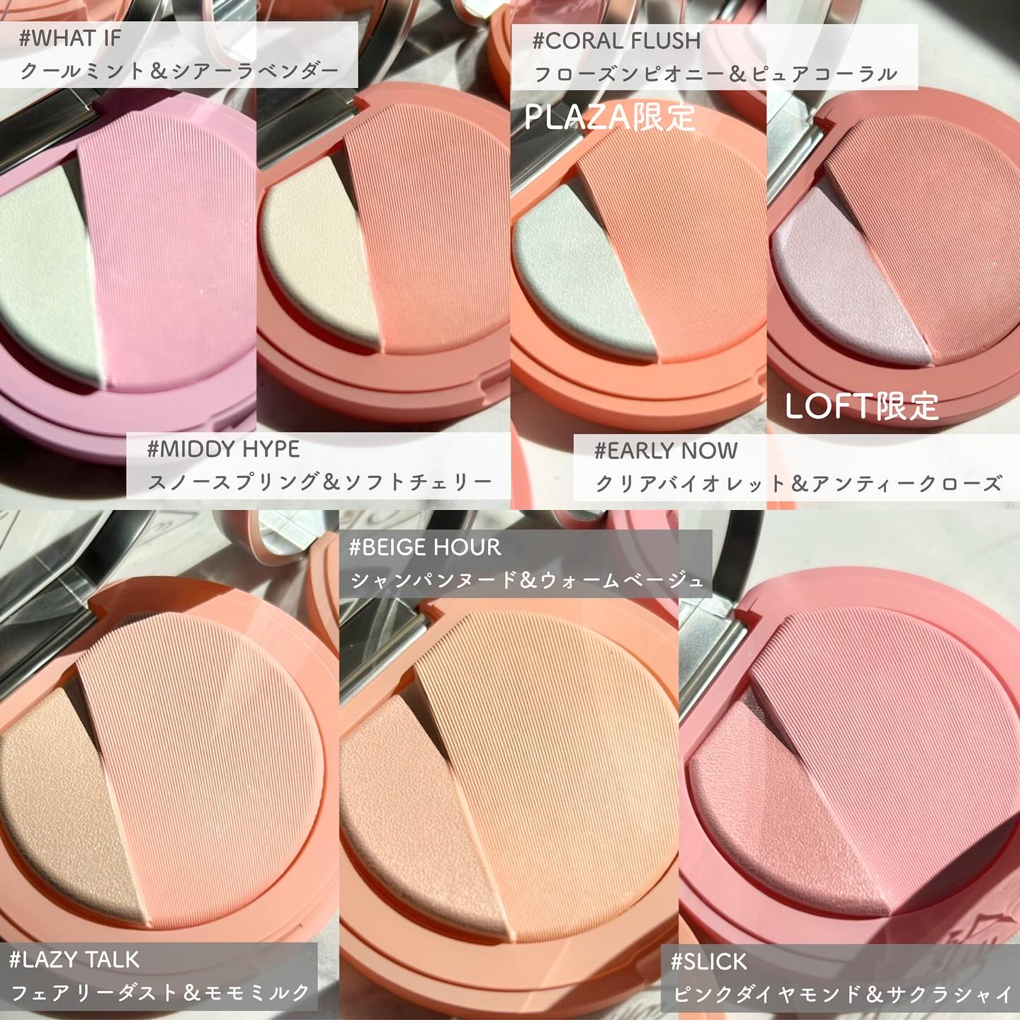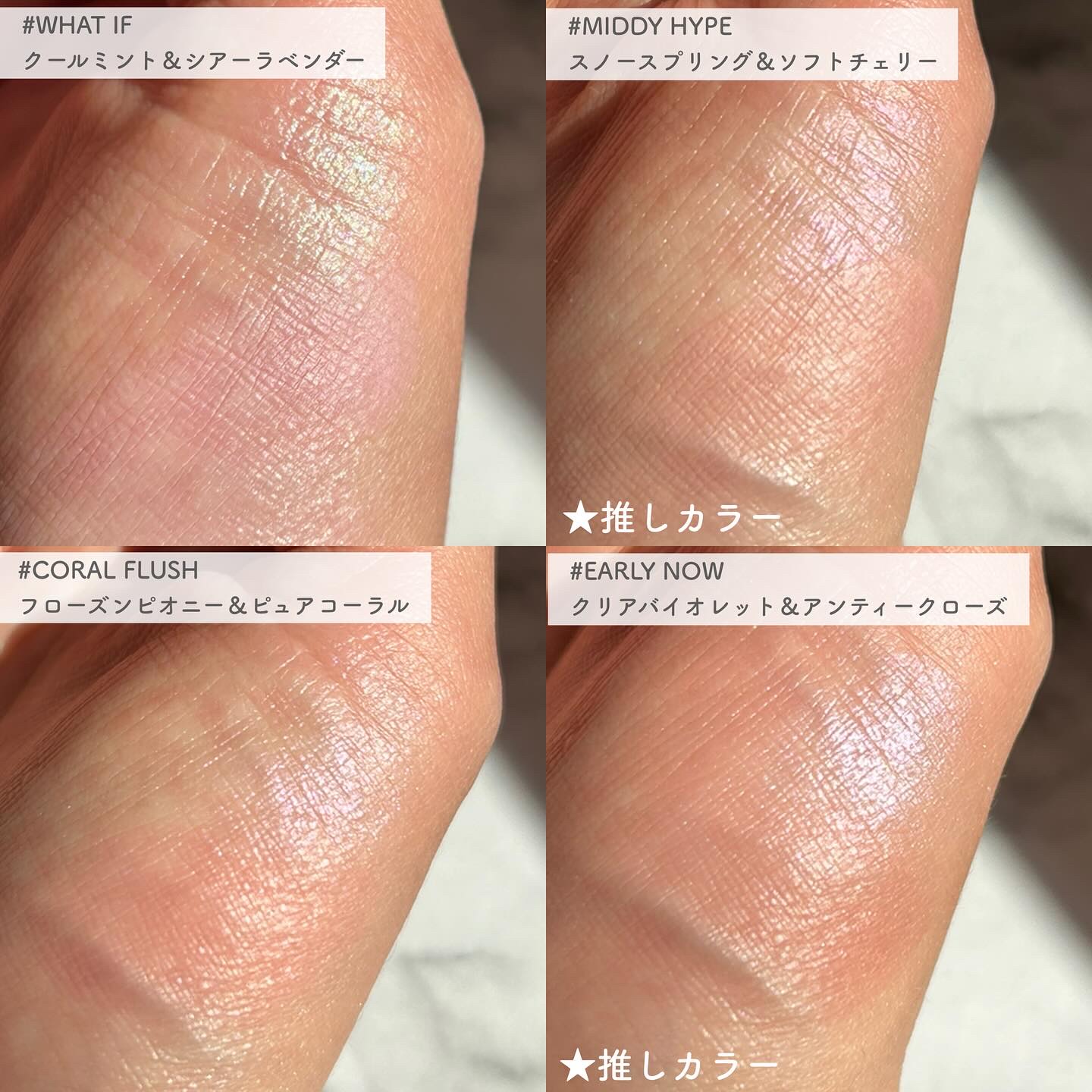 オーロラハイライトとヴェールチークがひとつに! WHAT IF,MIDDY HYPE,EARLY NOW,CORAL FLUSHの4色は反対色で入っていて“盛れツヤほっぺ”に🩷 LAZY TALKとMIDDY HYPEが気に入っています🥰 パケもシンプルで大きさ的にも持ち歩ける◎ 可愛くてお気に入りの製品です💗 これが私の初3CEでした🙂↕️🙂↕️🙂↕️