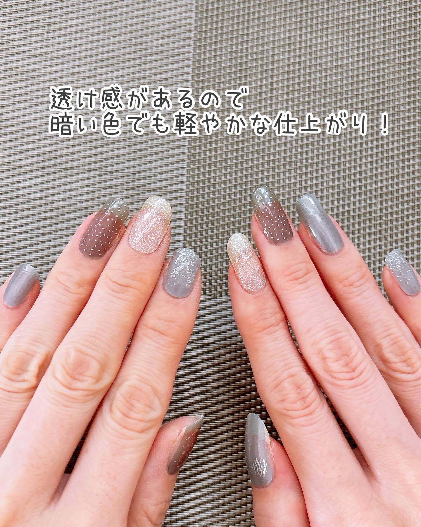 スリコからシルキーマグネットジェルが新発売! おしゃれなくすみカラーとなっています。 アイボリーのネイルチップの上に一度塗りしました。 爪の上に直接塗ると透け感が強いので、重ね塗りしたほうがよさそう。今回のように他の色を塗った上から使うのもお...