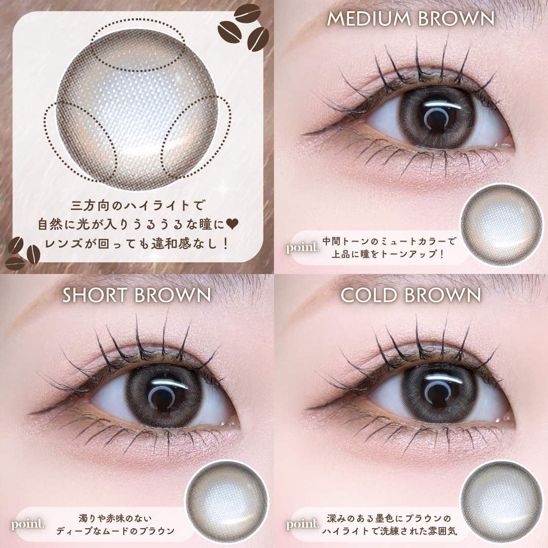 日常の中のコーヒーのように毎日つけたくなる デイリーブラウンコレクション🤎 明るく輝く三方向ハイライトで瞳に光が入りレンズが回っても違和感なし🫶🏻️ 絶妙なカラーでどれも使いやすく ナチュラルに盛れてお気に入り🫶🏻️