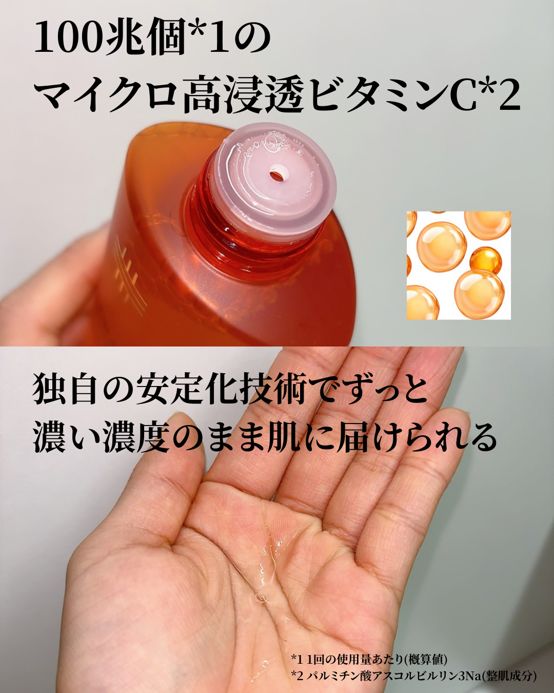 100兆個のマイクロ高浸透ビタミンCが肌のうるおい、弾力、つや、キメにアプローチ✨ とろっとしていて、かなり重ための使用感。 なのにいつの間にか馴染んでサラッとした手触りに😳💕 これなら朝からも使えちゃう!
