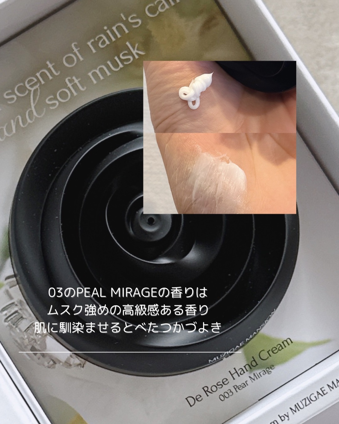 ムジゲマンション初のオブジェハンドクリーム🌹 ✅サラッとしたベタつきのないテクスチャー ✅保湿成分20%配合でしっとりとした保湿感 ✅使った後の手元がほのかに香る 今回使用したのは003 Pear Mirage 爽やかさと大人っぽさが感じられる香りだったよ♩ 黒バラハンドクリームなんて今まで見たことないし、オブジェと同じパッケージで、プレゼント用にも超おすすめ♡