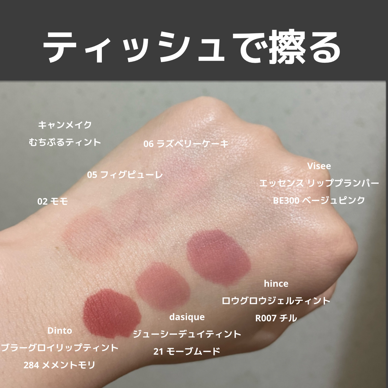 唇が荒れることなく安心して使えるティント 良心的な価格でいろんな色にチャレンジできる 色も質感も1番好み 匂いは甘い美味しい匂い 時間が経つとツヤが浮き出るタイプ 乾燥しちゃうと汚いかも