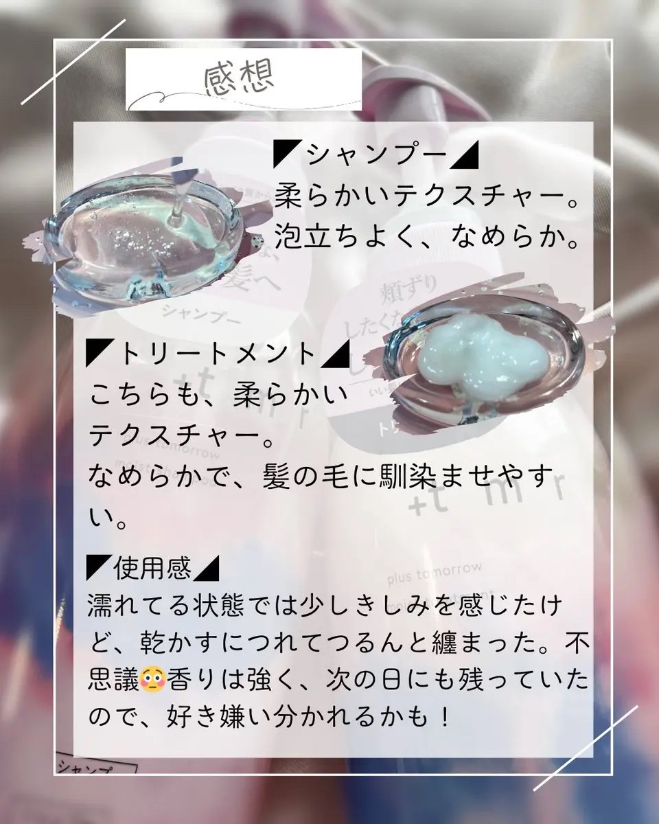 パケの可愛さで以前から気になっていたプラストゥモローさん。 このパケは吉兆のサインとも言われている、“彩雲”をデザインモチーフにしてるんですって。 シャンプーは泡立ちも良く気持ちよく洗えます。 フレッシュフローラルの香りが爽やかで心地良いですね。 トリートメントは緩めのなめらかテクスチャーです。洗い流すときはトゥルンとした手触りなのが気にいりましたよ!