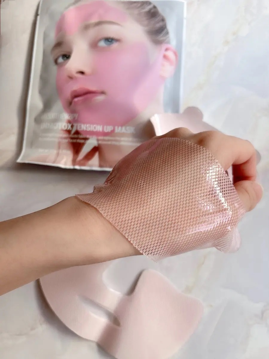 韓国で貼るボトックスと話題の3重構造マスク 小顔リフトアップテンションアップマスク🕊️ 耳にかけて固定するから物理的にたるみケアできる! 使い方は頬や口まわりのマスクを外に引っ張るように貼り、次に顎から引っ張りながら耳にかけます。 高濃縮ハイドロゲルのマスクは水分の蒸発を防いでくれるから長時間の使用でも乾かない。