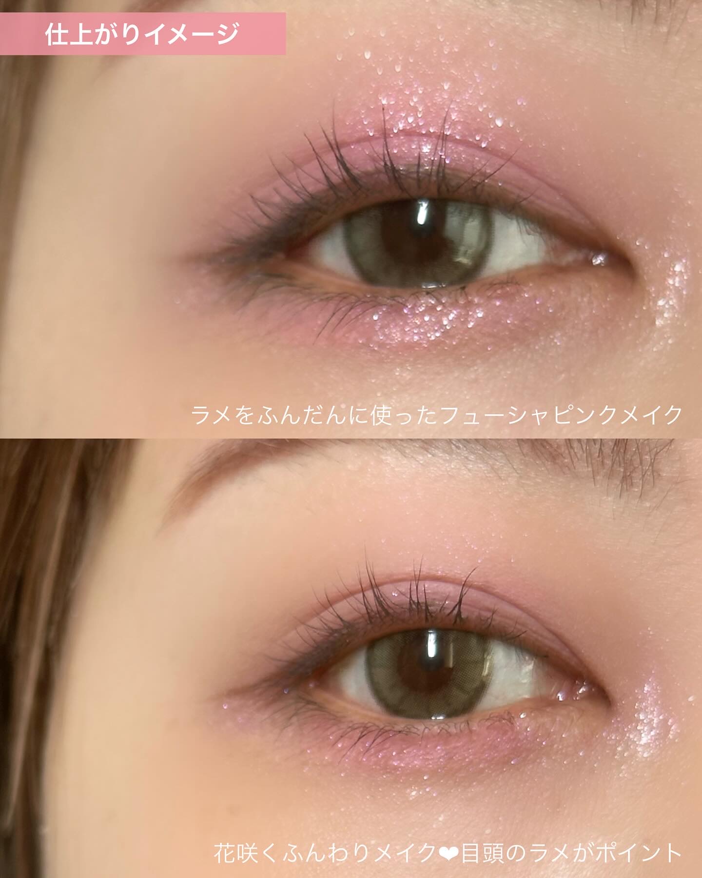 このパレットは、黄味が少なめでブルベにも使いやすいブラウン。 発色はしっかり目だけど、ブラシで調節も可能なので幅広い人に使いやすいパレットだと思います🎀✨ ラメ感も少しずつ異なり、華やかさを抑えたい時は右上を多めに使うと品の良いツヤのあるピンクブラウンメイクになります💎✨ 左上のラメカラーは白っぽいのでどんなアイシャドウとも相性抜群! この可愛い色味と煌びやかなラメは唯一無二です!