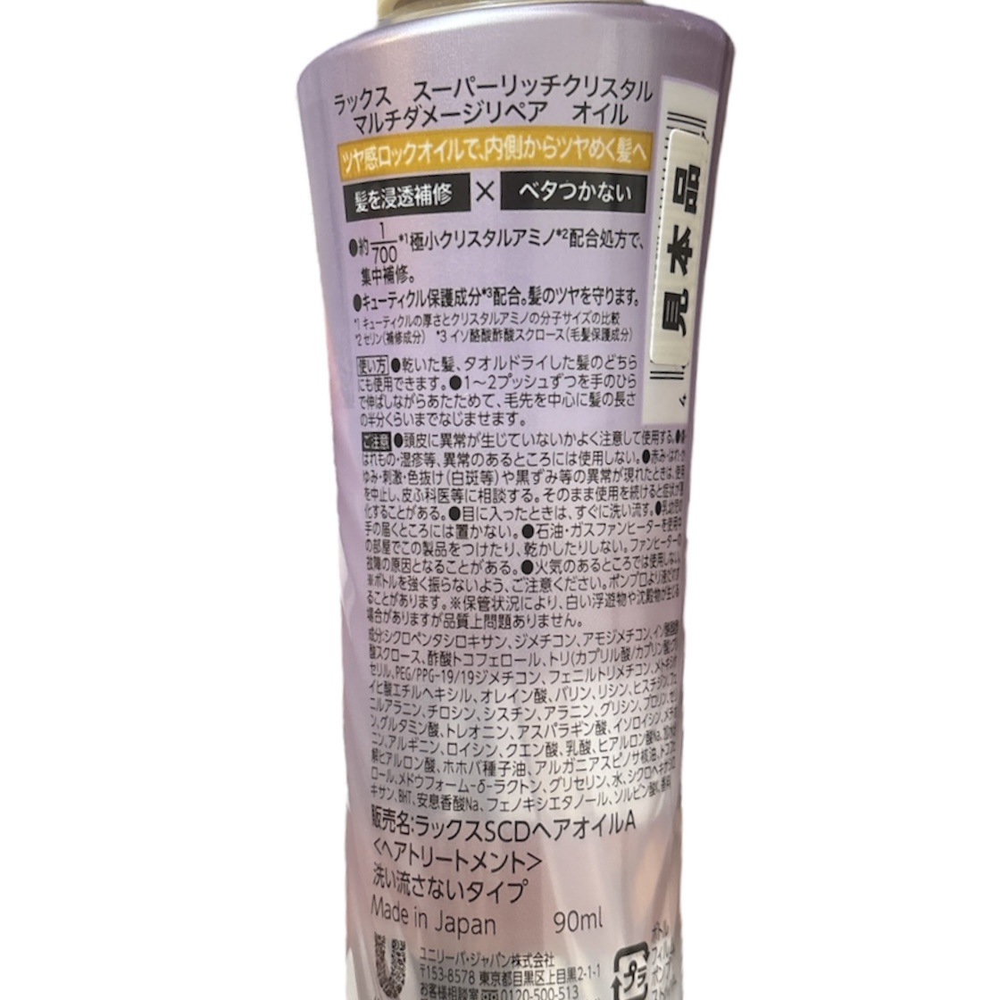 - 瞬間。クリスタルツヤ髪へ。 日常生活で受けやすい7大ダメージ(熱、摩擦、UV、カラーリング、ブリーチ、乾燥、パーマによるダメージ)を集中補修。 それを可能にした3つのLUXの先端技術。 ①約1/700*1極小クリスタルアミノ*2配合で、髪の奥まで浸透リペア ②クリスタルアルガンオイル*3配合で、外部刺激(熱/UVによる乾燥/摩擦)から徹底プロテクト。 ③髪の構成と同じ17種のアミノ酸*4配合により、まばゆいほど光をふりまくツヤ満ち髪へ。 総合的に髪の7大ダメージにアプローチするマルチダメージリペアシリーズはこんな方にオススメ! ✔髪がよく絡まるようになった ✔ツヤがなくなってきた ✔枝毛・切れ毛が気になる 枝毛・切れ毛を防ぎ、ツヤめくなめらかな髪へ導きます。 *1:キューティクルの厚さとクリスタルアミノの分子サイズの比較 *2:セリン(補修成分) *3:アルガニアスピノサ核油(毛髪保護成分) *4 アルギニン、アスパラギン酸、トレオニン、グルタミン酸、セリン、プロリン、グリシン、アラニン、シスチン、チロシン、フェニルアラニン、ヒスチジン、リシン、バリン、イソロイシン、メチオニン、ロイシン:補修・保湿成分