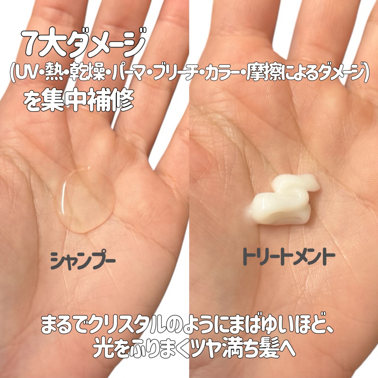 7大ダメージ(UV・熱・乾燥・パーマ・ブリーチ・カラー・摩擦によるダメージ)を集中補修して、クリスタルのように、まばゆいほど、光をふりまくツヤ満ち髪へ。 シャンプー、トリートメントをしたら、しっとりまとまりのある髪に。 さらにヘアオイルで仕上げると、指通りなめらかでサラッサラの髪になったよ! スズラン&ジャスミンの優雅な香りがふんわり続いて、リラックスできるのも嬉しいポイント。