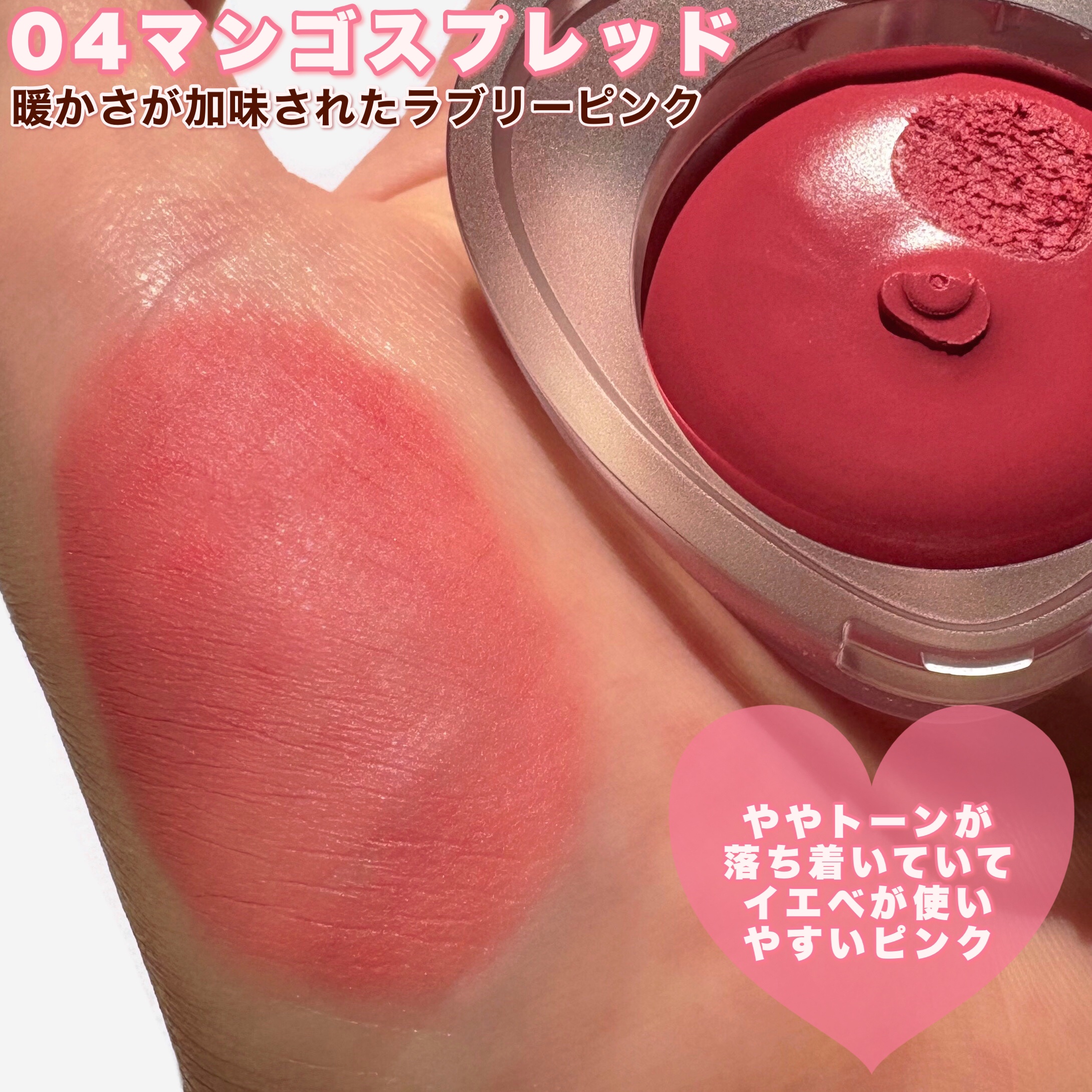 - ふわふわのスフレテクスチャーが優しくブラーリングされ、唇と両頬に愛おしい生気を加えてくれるマルチハートカラーポット。 【Point1】ふんわりやわらかい#ふわふわスフレテクスチャー!ふわふわしたスフレテクスチャーでべたつかず、サラッとした仕上がりになります。 【Point2】トーン別、15種カラー!似ているカラーなくトーン合わせ。愛おしいカラー盛り込んだカラーバリエーション。 【Point3】ラブリーさと便利さをすべ盛り込んだ#ハートカラーポッド!ハートシェイプのラブリーな外観とミニリップスマージングブラシ内臓で手軽にキレイなハートブラーリンリップの演出が可能です。