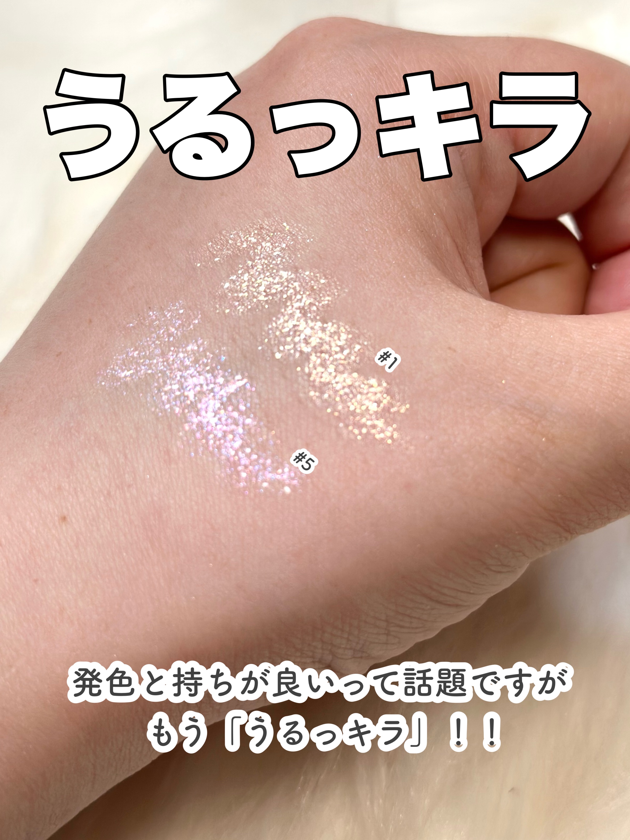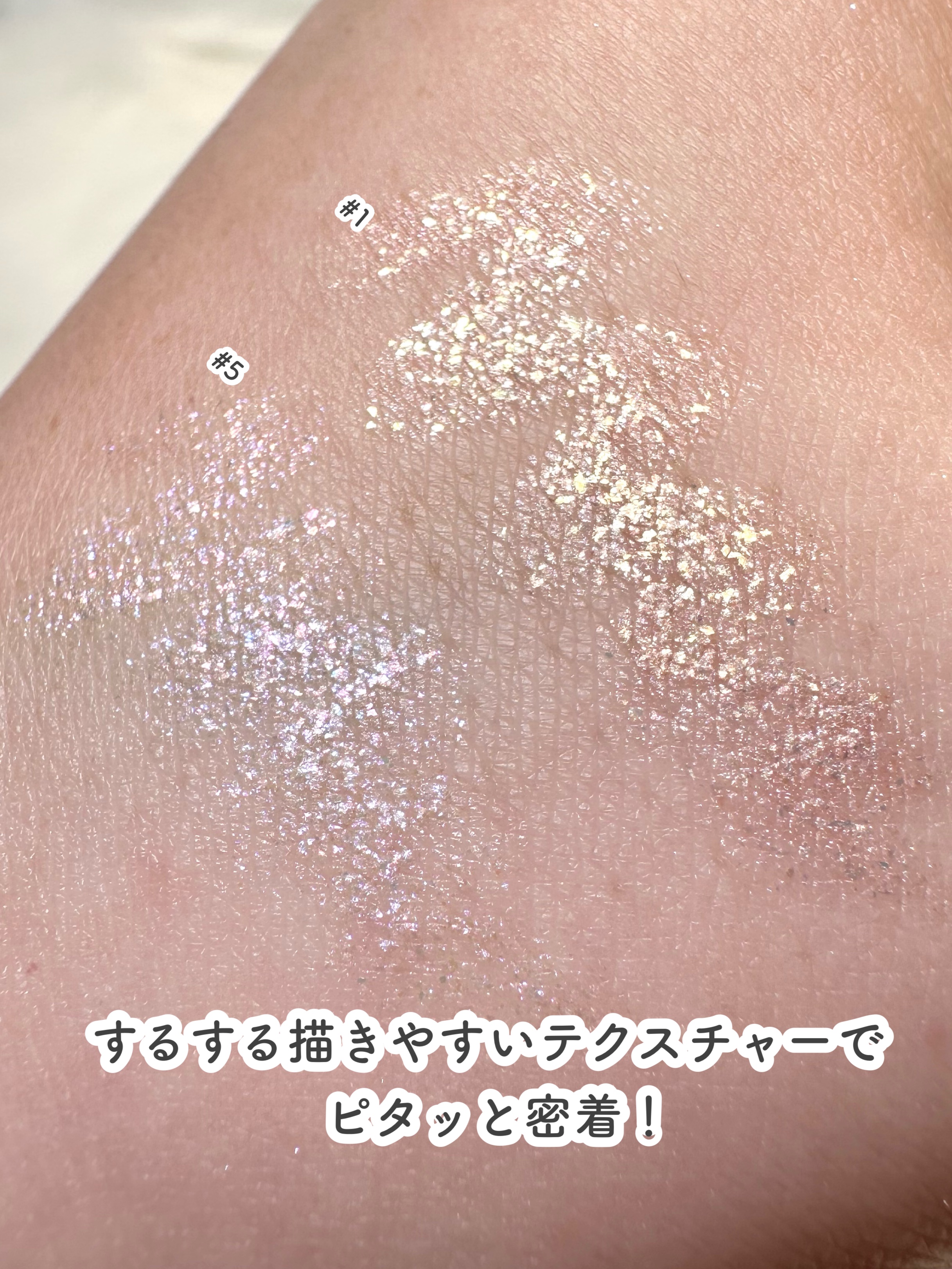 繰り出しのペンシルタイプのグリッターで、繊細なパールと大粒のラメがしっかり密着します。今までリキッドでしか表現できなかったような大粒のラメをペンシルで手軽にのせられるのがすごい✨ するする描けるなめらかなテクスチャーで、まぶたに引っかかることなくスムーズに塗れます。ピタッと密着してヨレにくく、ラメ飛びの心配も少ないから長時間キラキラが続くのも嬉しい! ホワイト&ゴールドパールが加わったナチュラルピンクグリッター。肌なじみがよく、どんなメイクにも合わせやすい万能カラーです♡