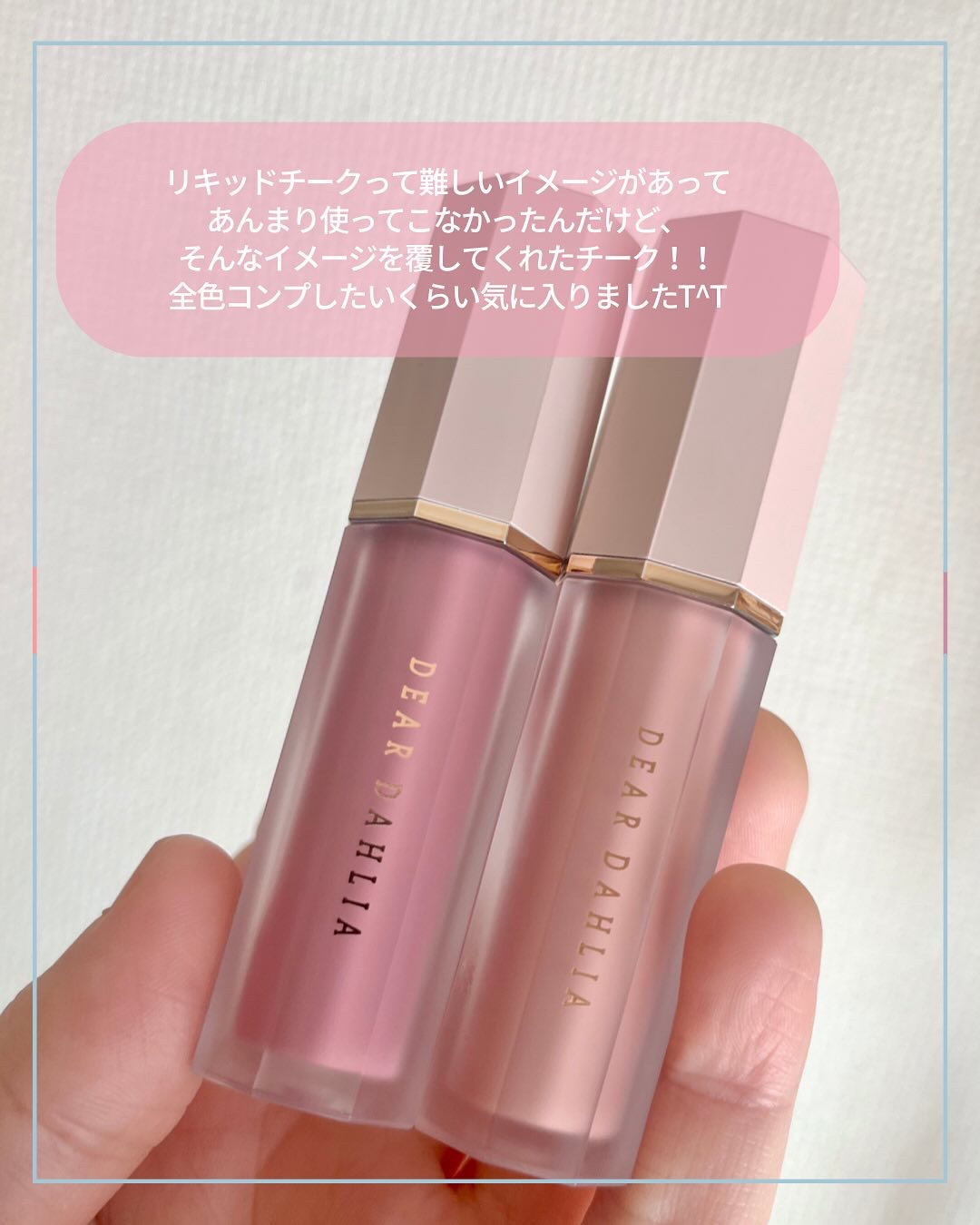 ディアダリアのコスメのパケもキラキラで大人かわいい🌹 DEAR DAHLIA ディアダリアのペタルドロップリキッドブラッシャー 3色レビューした🤗 じゅわっと湯上がりメイクができる😍 そのままブラシを使ってもいいし、指でトントンと伸ばしてもいい! リキッドチークでツヤツヤ✨