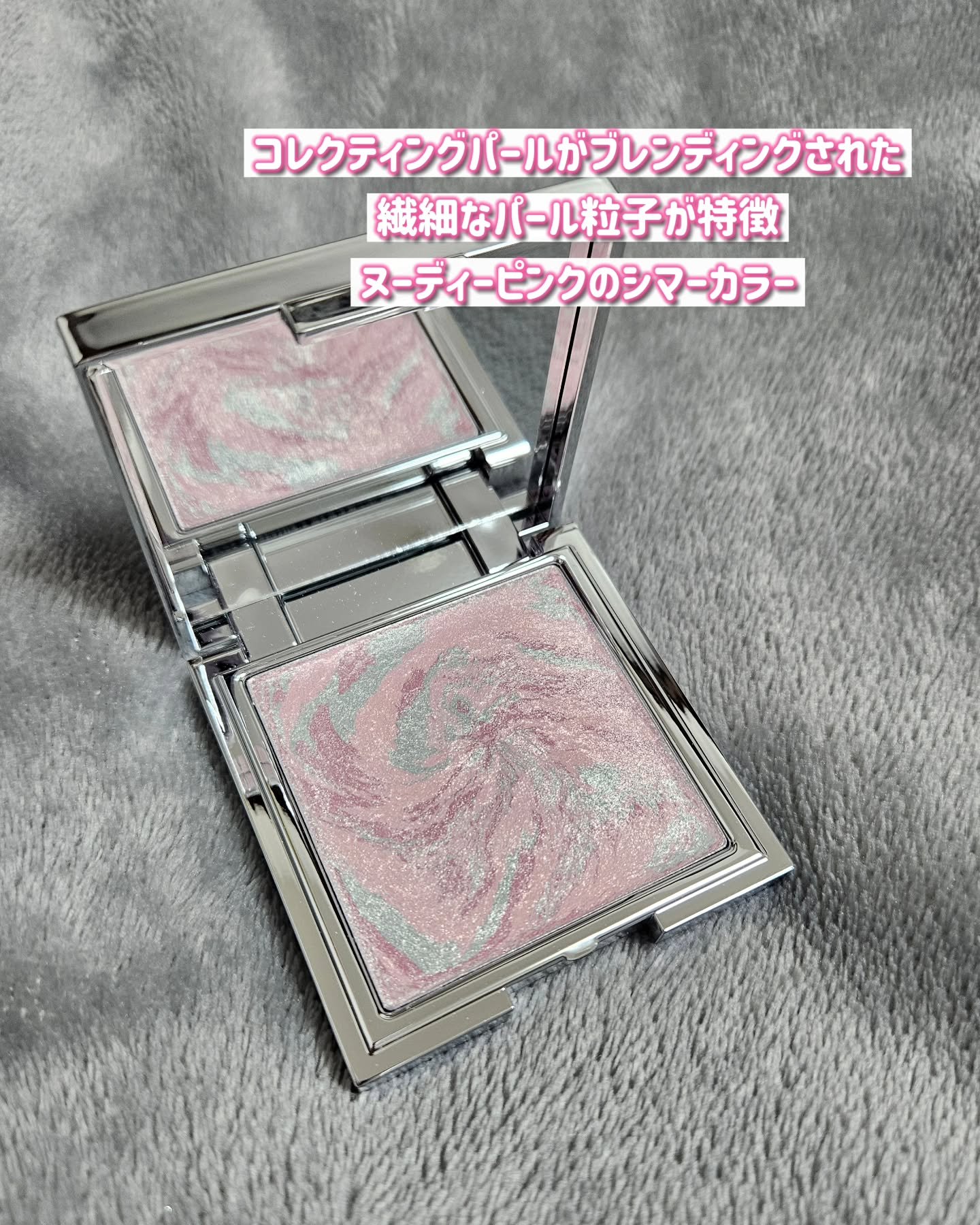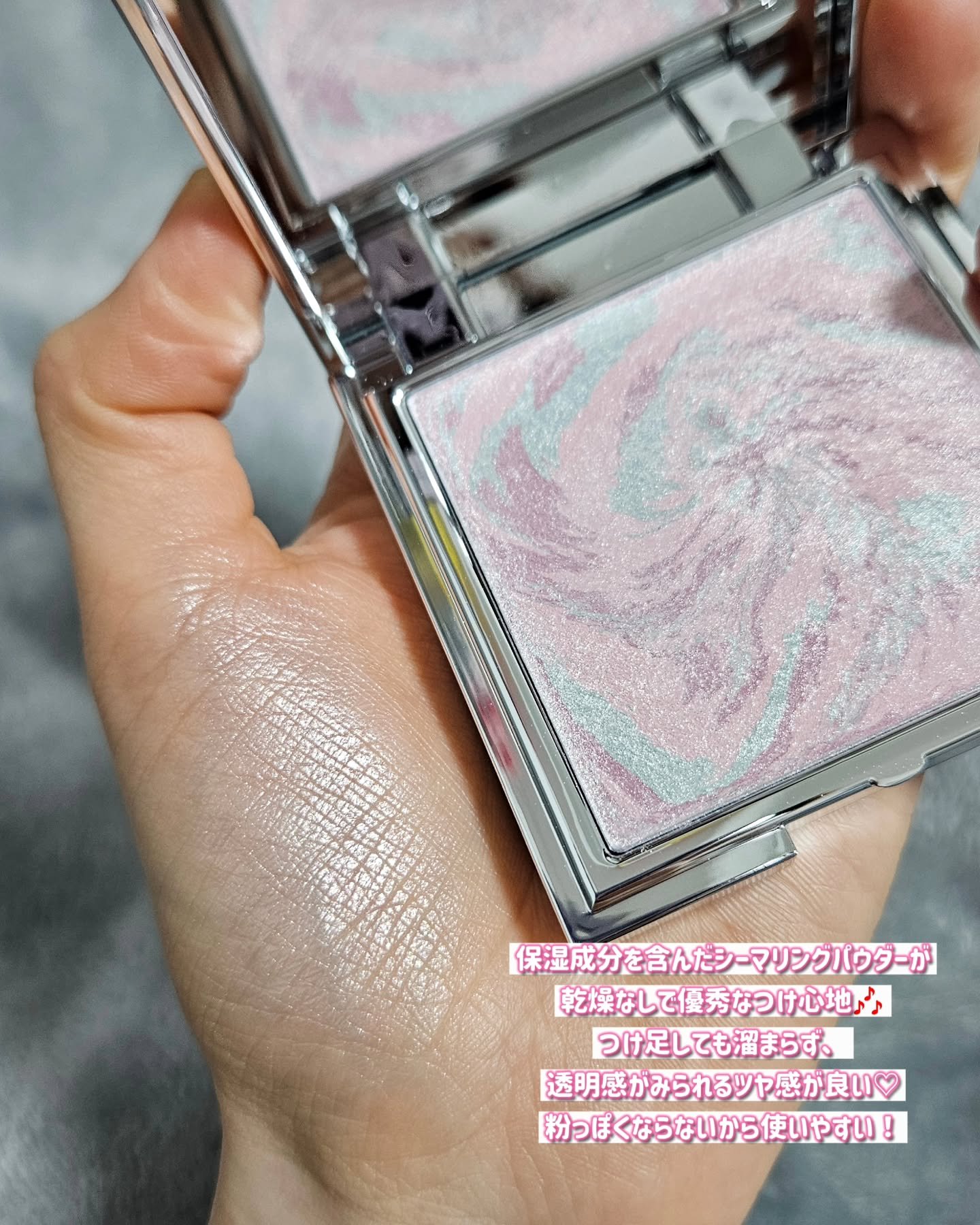 3色のマーブルブレンディングが灰かにに満ちてくる透明な光沢 相手をドキッとさせる、つやんつやんなオパール肌になれちゃう素敵なハイライターなんです💕 仕上がりびっくりするほど美しいし、パケも中身も美しいの!!