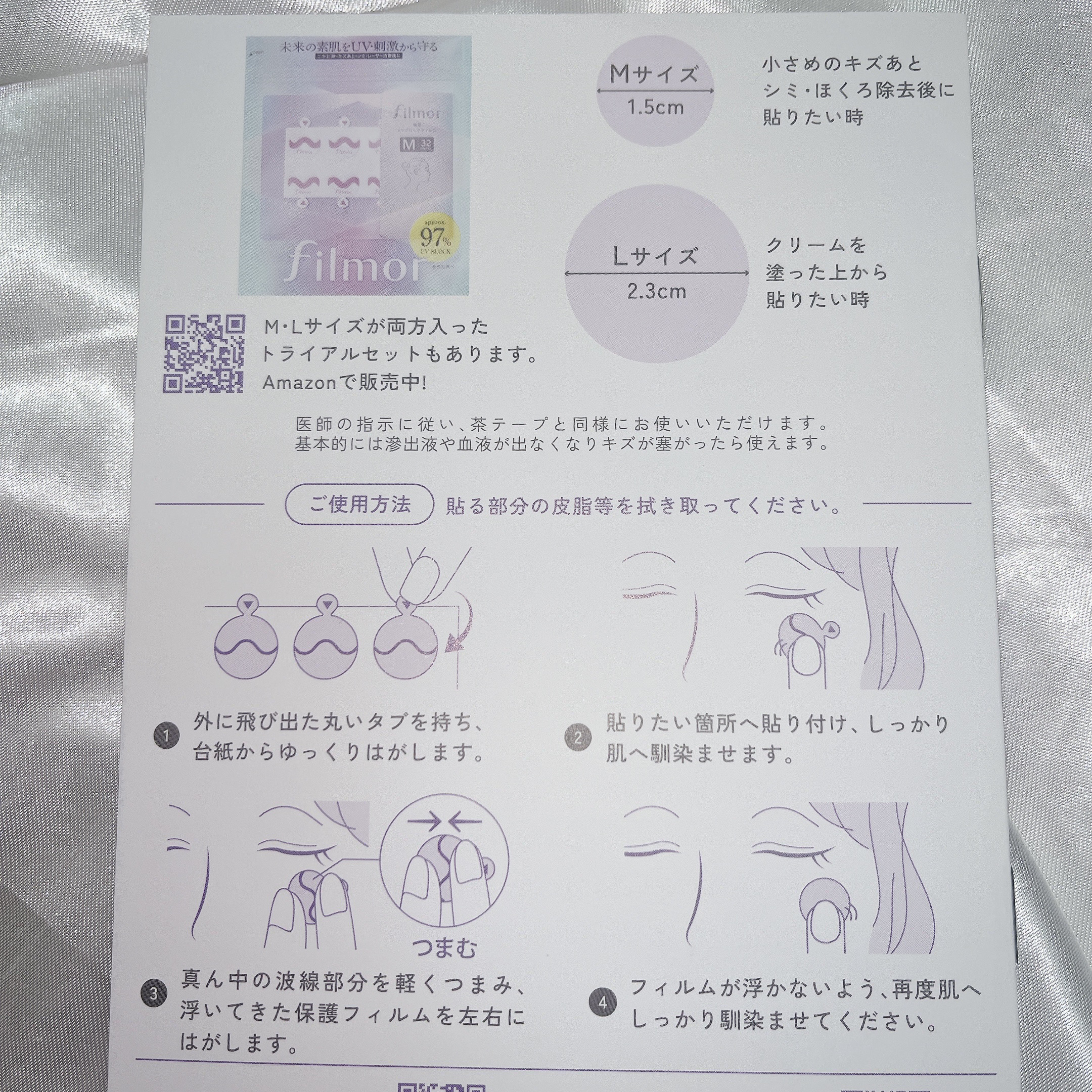 - UVを約97%*1カットして、ニキビ跡・キズあと・シミ・レーザー後の肌を守る*2、極薄UVブロックフィルム。 日常使いから、ゴルフ・海水浴などのアウトドアまで、幅広くご使用いただけます。 【貼っている間ずっとUV・摩擦や乾燥の刺激から肌を守る】 filmorは貼っている間、高いUVブロック率がずっと続きます。 衣類等との摩擦にも強く、防水性があるため、肌からはがれにくく長時間ご使用いただけます。 【快適な貼りごこち】 フィルムの薄さは0.007mm(卵の薄皮の約1/10の薄さ)と極薄。貼っていることを忘れるほど、とても軽くやわらかい貼りごこちです。 また、汗をかいてもムレにくいフィルムを使用しているので暑い季節でも快適にお使いいただけます。 【透明で目立ちにくい】 透明でテカリを抑えたフィルムなので、周りから貼っていることが気付かれにくいです。 また上からメイクをしていただくと、さらに自然な仕上がりに。 フィルムを貼ることで、キズあとに直接化粧品や指が触れることを防ぎます。 *1自社調べ *2フィルムの物理的効果による