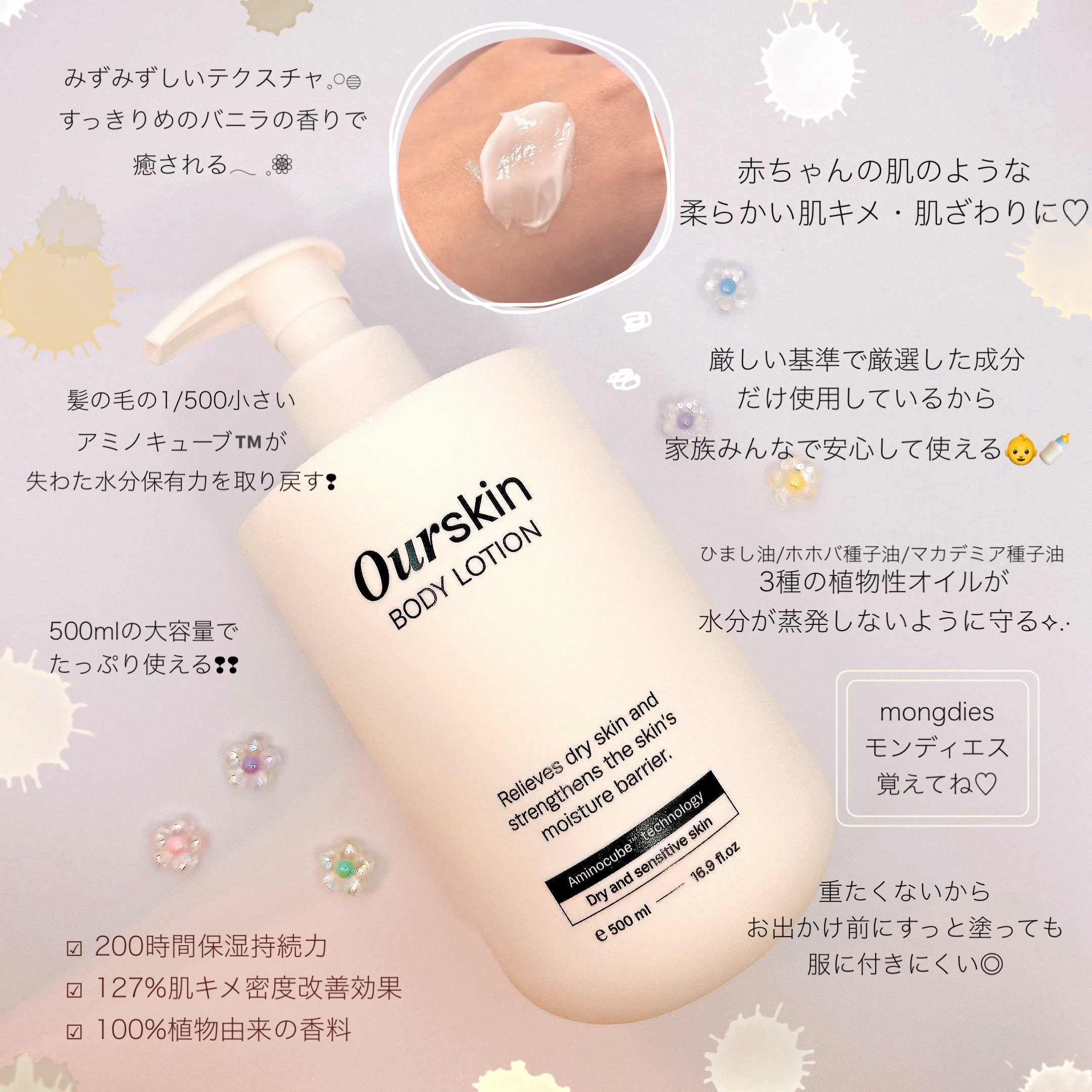 ポンプタイプで、お風呂上がりなど使いたい時にさっと使えて便利です。 なめらかなテクスチャーのボディローション。すっと伸びて、なじんでくれます。 べたつかず、軽やかな使用感なのでこどもにも塗りやすくて嬉しい!爽やかな甘さの良い香りがします。 韓国モンディエスの研究集大成のファミリーダーマケアボディローション。ベビー等級の全成分で赤ちゃんから大人まで使える!