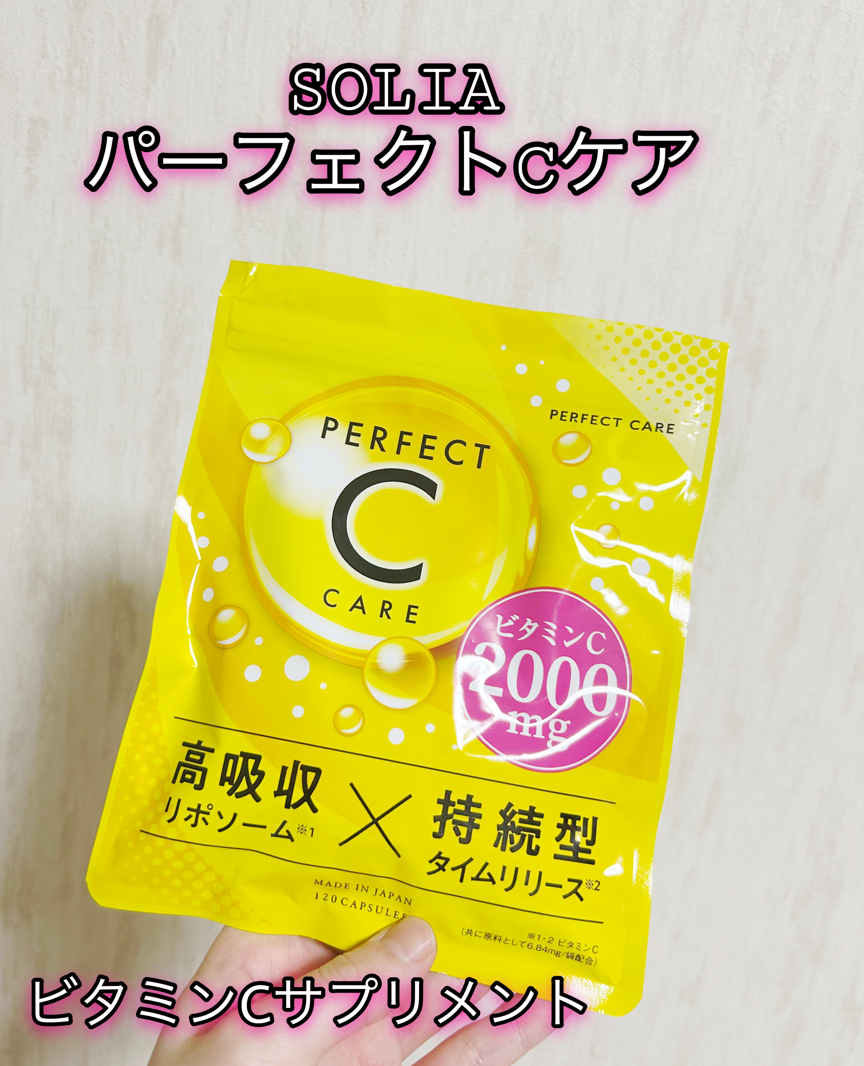こちらはリポソーム化されたビタミンCのサプリメントだそうです。リポソーム化されたビタミンCは高濃度で、親和性が高く、吸収されやすい特徴があるそうで、パーフェクトCケアにはリポソームビタミンCを1日あたりの目安量4粒あたり2000mg配合しているそうです。 カプセルタイプなので味やにおいも感じないですし、サイズじたいもそこまで大きくないので飲み込みにくいとかはないので続けやすいなと思います。