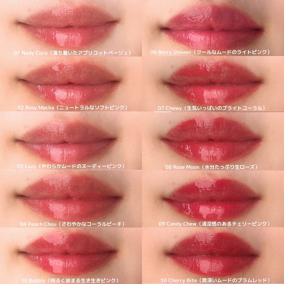 - ほんのりプランピング効果で痛くないぷっくりティント。 もっちりなのに嫌なべたつきがなく使いやすい。 縦ジワがなくなる綺麗な唇を~! ひと塗りで輝く、 澄んだ透明感あふれるぷるんとしたキャンディツヤ🍭 ティントにグロスの長所をプラスしたテクスチャーで、 ベタつかず長時間続く光沢を ✧˖*°࿐