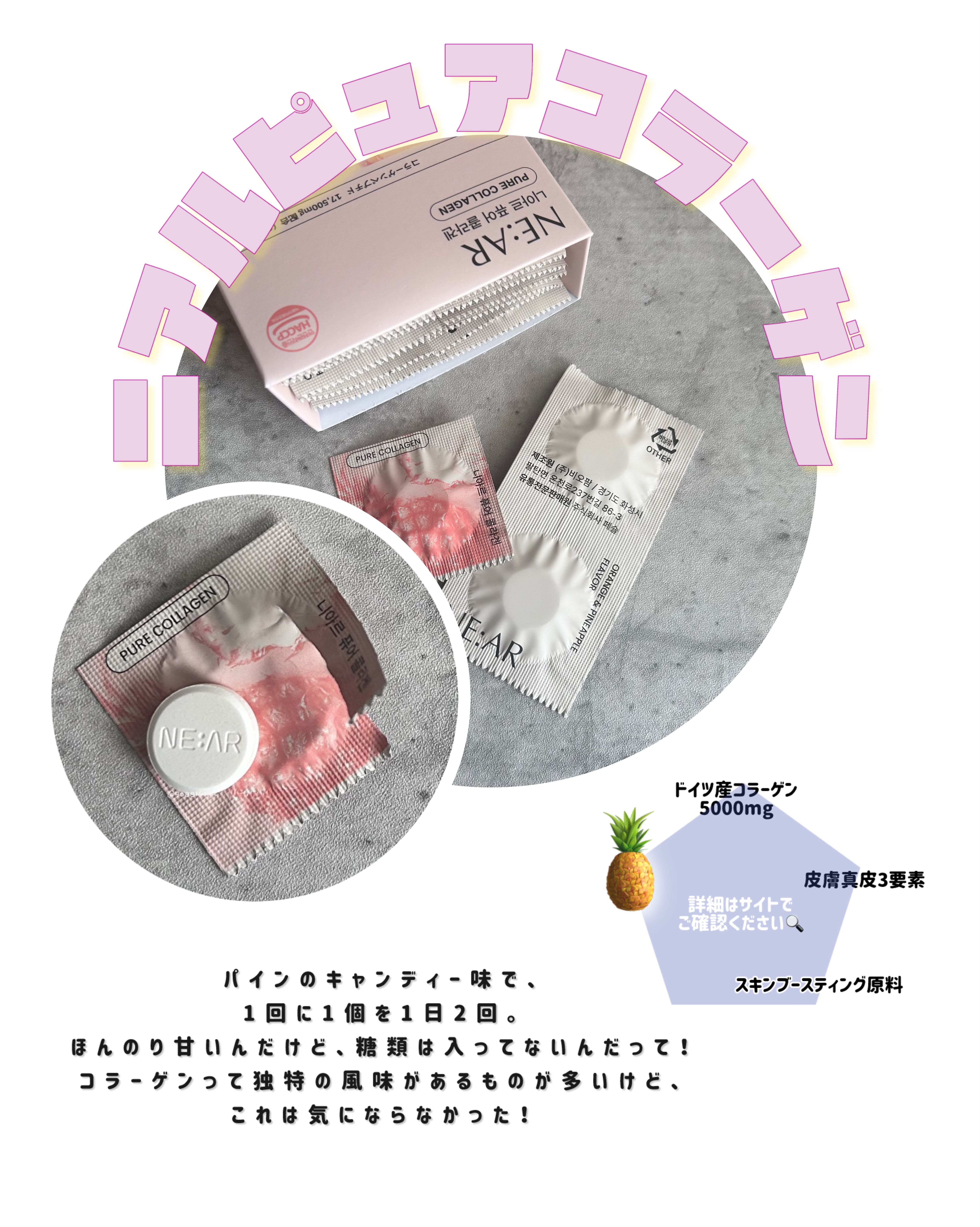 おやつ感覚で食べれるNE:ARのタブレット好きすぎる、🩷 気になる浮腫に!朝のメイク前、メイク中に食べるのがおすすめらしい、♡ 持ち運びしやすい個包装で水なしで食べられるタブレットタイプ🥰 カバンやポーチに入れやすい!しかもパッケージもおしゃれ♡ TWICEのサナがアンバサダーを務めているよ✨ サナみたいな美しさを目指したい、、♡