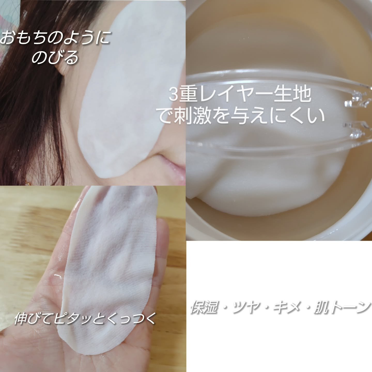 はずしたあとは顔になじませてもちもちに♡ マスクに残ったものも首まわりに使うと◎ お肌が生き返ったような使い心地でした♬ 化粧水でお肌のキメを整えてから使う薄手のマスクで、 液垂れせずお肌にピタッと密着してくれたよ! 忙しい朝はササッと3-5分程度、 時間がとれる日は10-20分位じっくりつけるよ◎