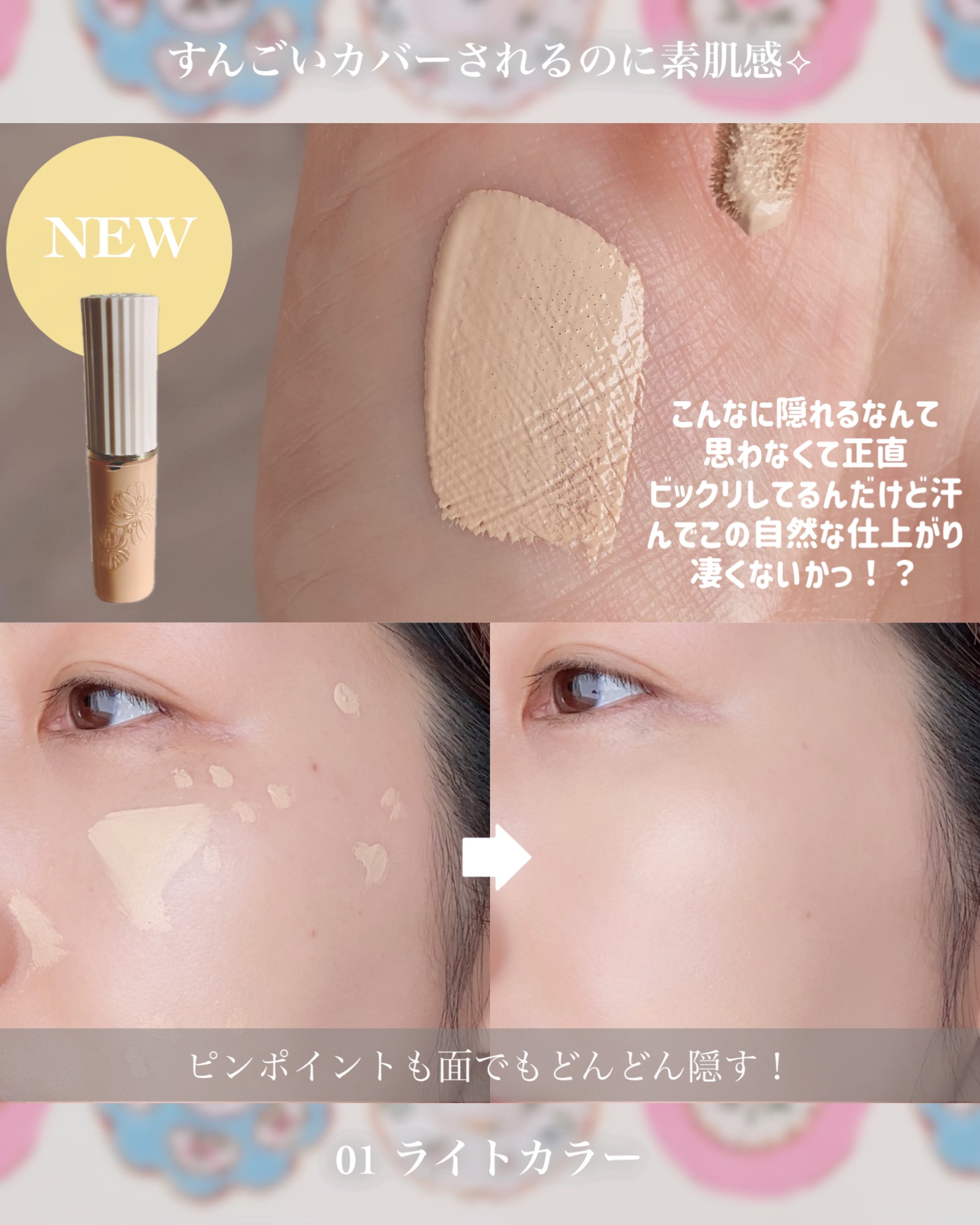 美容液約90%配合されていて、まるで美容液のようにみずみずしいです。 まだ3月だと乾燥も気になります。 SPF50+ PA++++‼️ プライマーなので日焼け止めみたいなキシキシ感もなく伸びやすいテクスチャーですごくよかったです☺️ コンシーラーはリキッドタイプ✨ クリーミィな仕上がりなので、目のクマをカバーするにも優しいです🐻