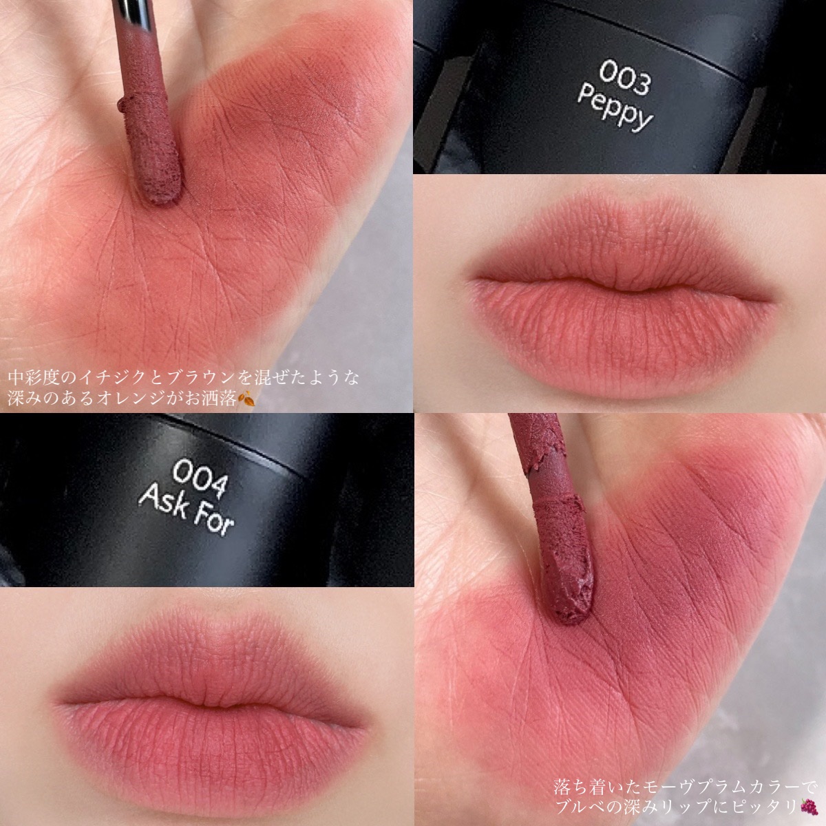 マットティント苦手民にぜひ使って欲しい🥹 より優れた密着力、にじみのないフィクシング力のあるティントがオススメ🙌🏻 ふわふわしたムーステクスチャーで色持ちが良い!! 私がお気に入りなのは03.04あたり💕 単色で唇にもチークにも使えます🫶🏻