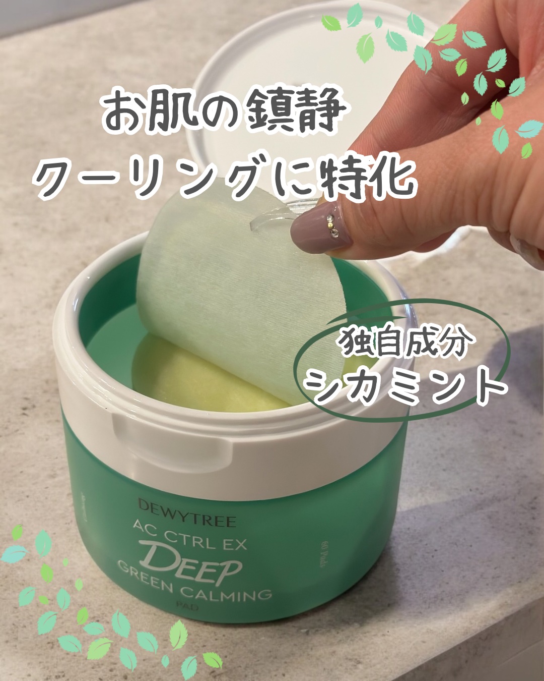 Kビューティーブランドデューイーツリーの BEST鎮静パッド🌟🌟 シカとペパーミントが合わさった、デューイーツリー独自成分シカミント™で熱や赤みを帯びた肌を鎮静してくれるよ。 グリーン極細糸生地を使用していて刺激ゼロで使用後しっとり感実感できたし、たるんだ毛穴までタイトに締まるからメイク前の使用にもおすすめだよ。