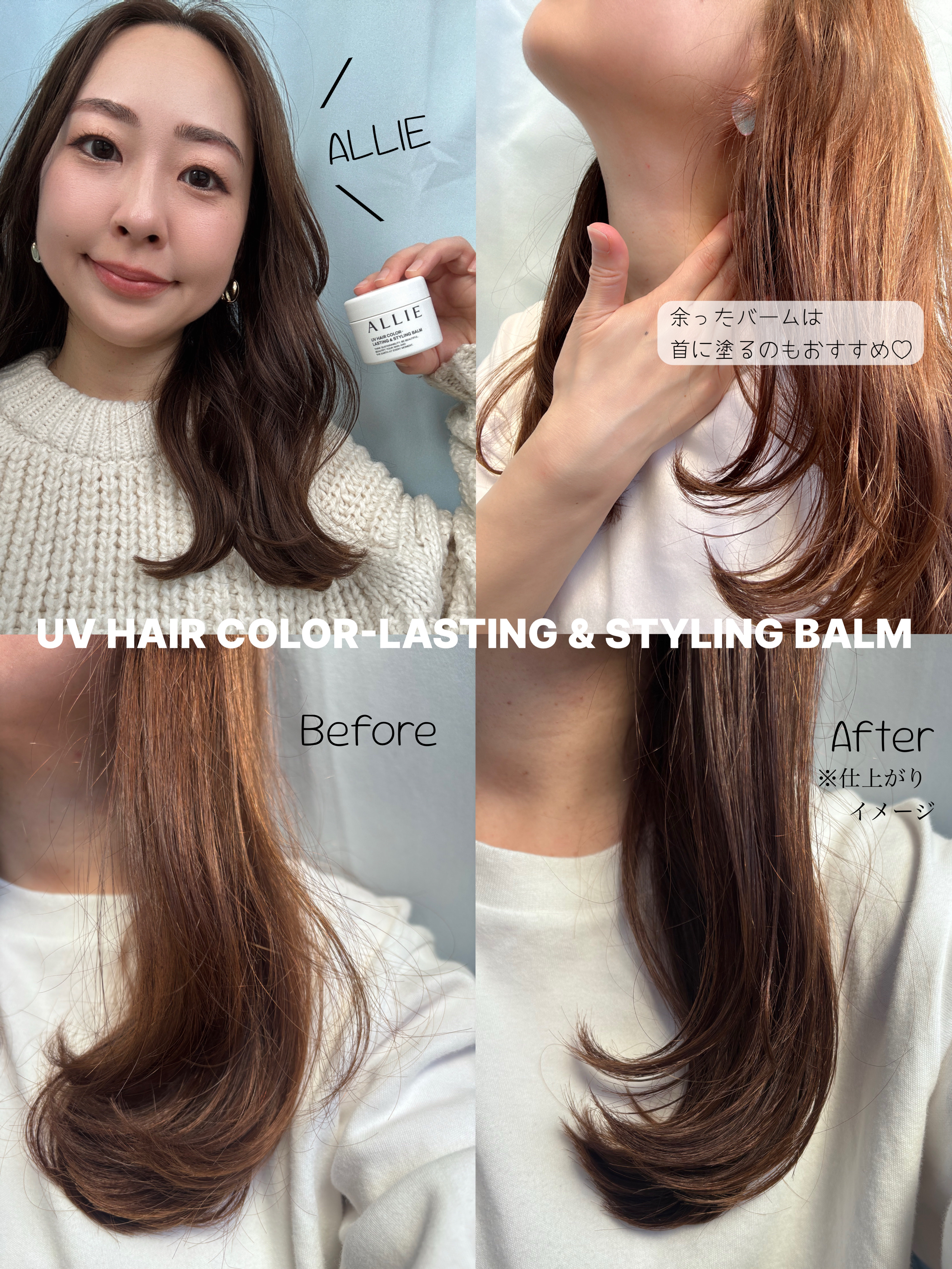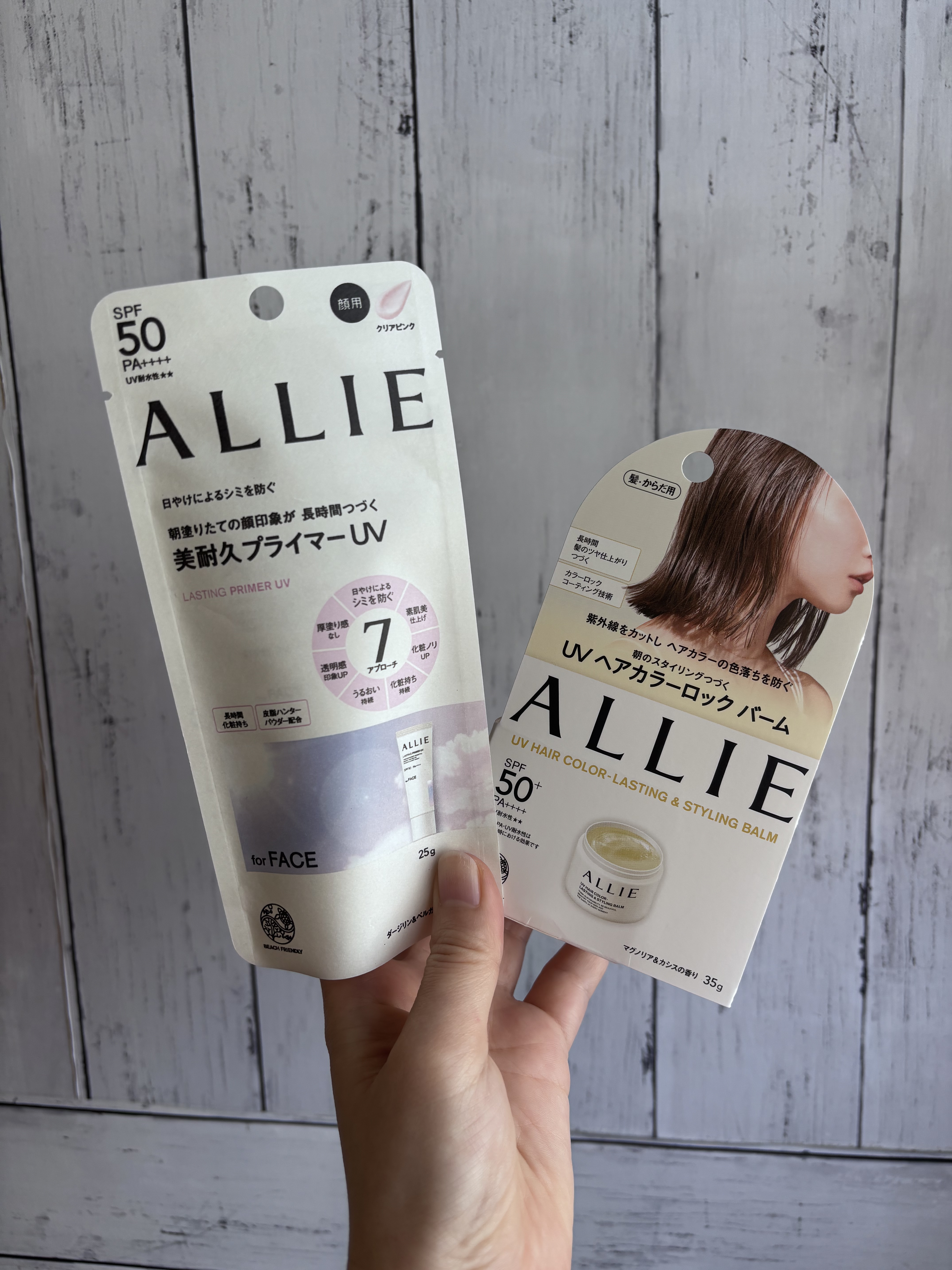 アリィーさまからいただきましたALLIE🤍クロノビューティUVヘアカラーラスティング&スタイリングバーム🤍クロノビューティラスティングプライマーUVヘアバームでスタイリングと髪の紫外線対策なできるの優秀アイテムでした、香りも最高😀#モニター企...